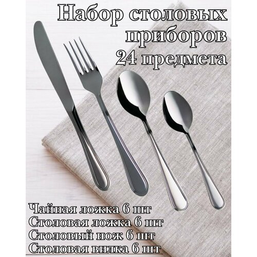 Набор столовых принадлежностей на 6 персон предназначен для сервировки стола. В комплект входит 24 предмета из высококачественной нержавеющей стали. Не подвержены коррозии, окислению. Выполнены в серебряном цвете. Практичный и элегантный набор ложек и вилок идеально подходит для оформления праздничного стола и ресторанных банкетов, а так же для повседневного использования. Кухонный набор придется любой хозяйке по вкусу и станет прекрасным на любое торжество. Для привлекательного внешнего вида не рекомендуется протирать посуду твердыми предметами, металлическими губками. При бережной эксплуатации набор столовых принадлежностей прослужит вам очень долго. Приобретайте наши столовые приборы и наслаждайтесь их эстетикой каждый день! В набор входит: