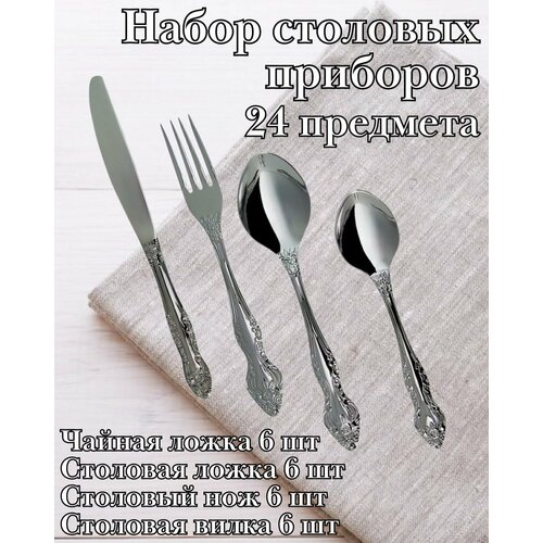Набор столовых принадлежностей на 6 персон предназначен для сервировки стола. В комплект входит 24 предмета из высококачественной нержавеющей стали. Не подвержены коррозии, окислению. Выполнены в серебряном цвете. Практичный и элегантный набор ложек и вилок идеально подходит для оформления праздничного стола и ресторанных банкетов, а так же для повседневного использования. Кухонный набор придется любой хозяйке по вкусу и станет прекрасным на любое торжество. Для привлекательного внешнего вида не рекомендуется протирать посуду твердыми предметами, металлическими губками. При бережной эксплуатации набор столовых принадлежностей прослужит вам очень долго. Приобретайте наши столовые приборы и наслаждайтесь их эстетикой каждый день! В набор входит: