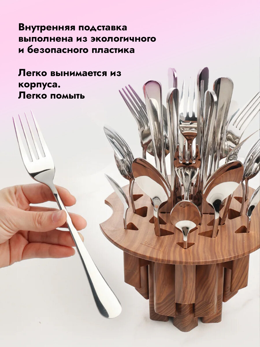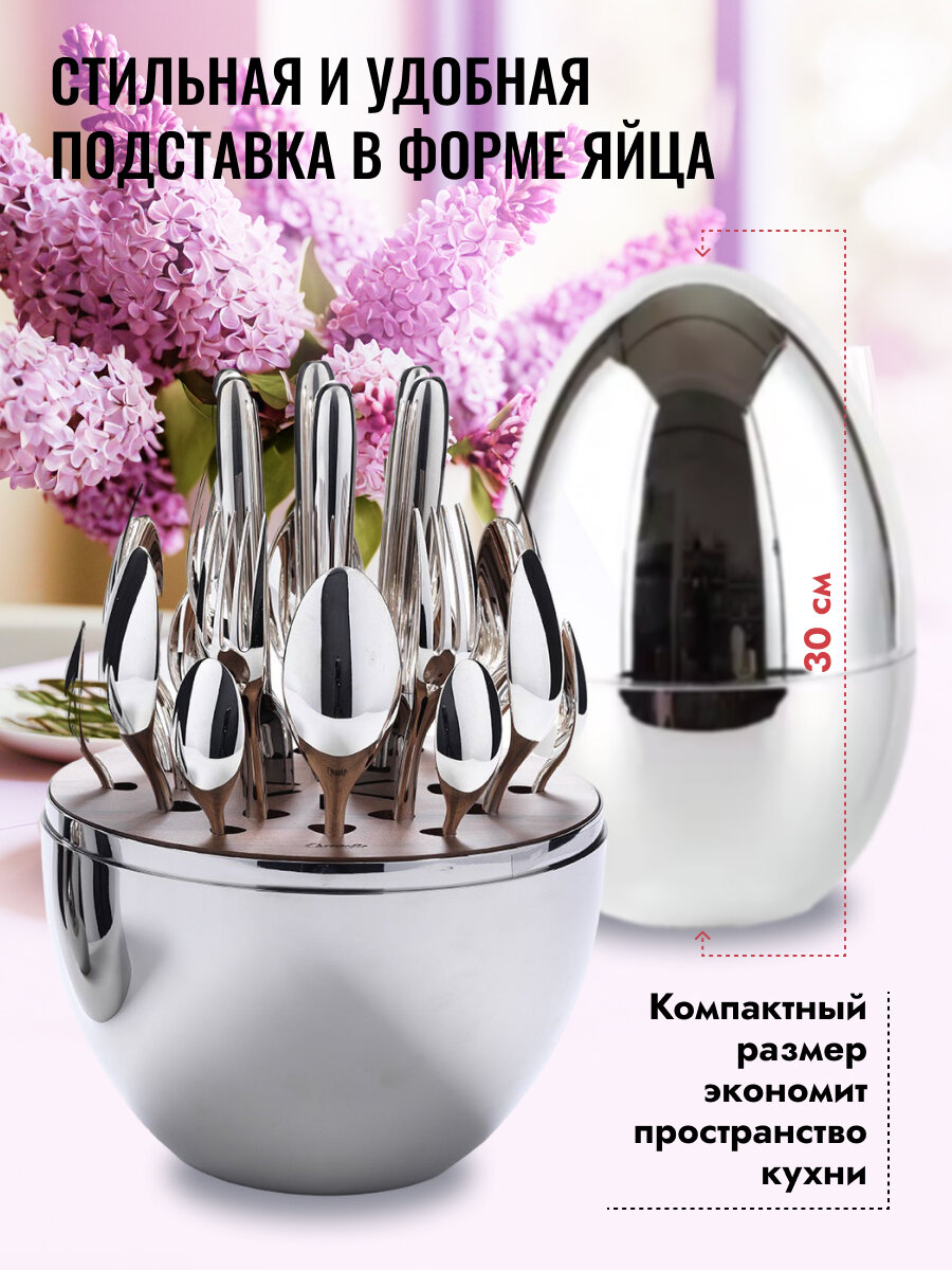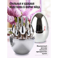 Хотите удивить подарком? Что подарить руководителю, коллеге, учителю, маме, на юбилей? Ответ на все эти вопросы прост: Набор столовых приборов Яйцо. Уникальный подарочный набор столовых приборов в подставке яйцо выполнен из высококачественной нержавеющей стали. В состав набора столовых приборов ножи, вилки, ложки столовые, ложки чайные на 6 персон + удобная эргономичная подставка для столовых приборов. Подарочный набор кухонных принадлежностей зеркально отполирован, не окисляется, сохраняет свой блеск очень долго. Набор столовых принадлежностей упакован в плотную подарочную коробку идеален для подарка маме, бабушке, девушке, подруге, коллеге, знакомым, на новоселье, новый год, день рождения. Ножи, ложки и вилки будут идеальным элементом сервировки стола к особому случаю и для повседневного использования. Столовые приборы легки в уходе их также можно мы в посудомоечной машине. А подставка для столовых приборов решит проблему с хранением ложек, вилок и ножей на Вашей кухне. Набор столовых предметов на 6 персон идеален в качестве подарка на день учителя.
