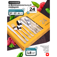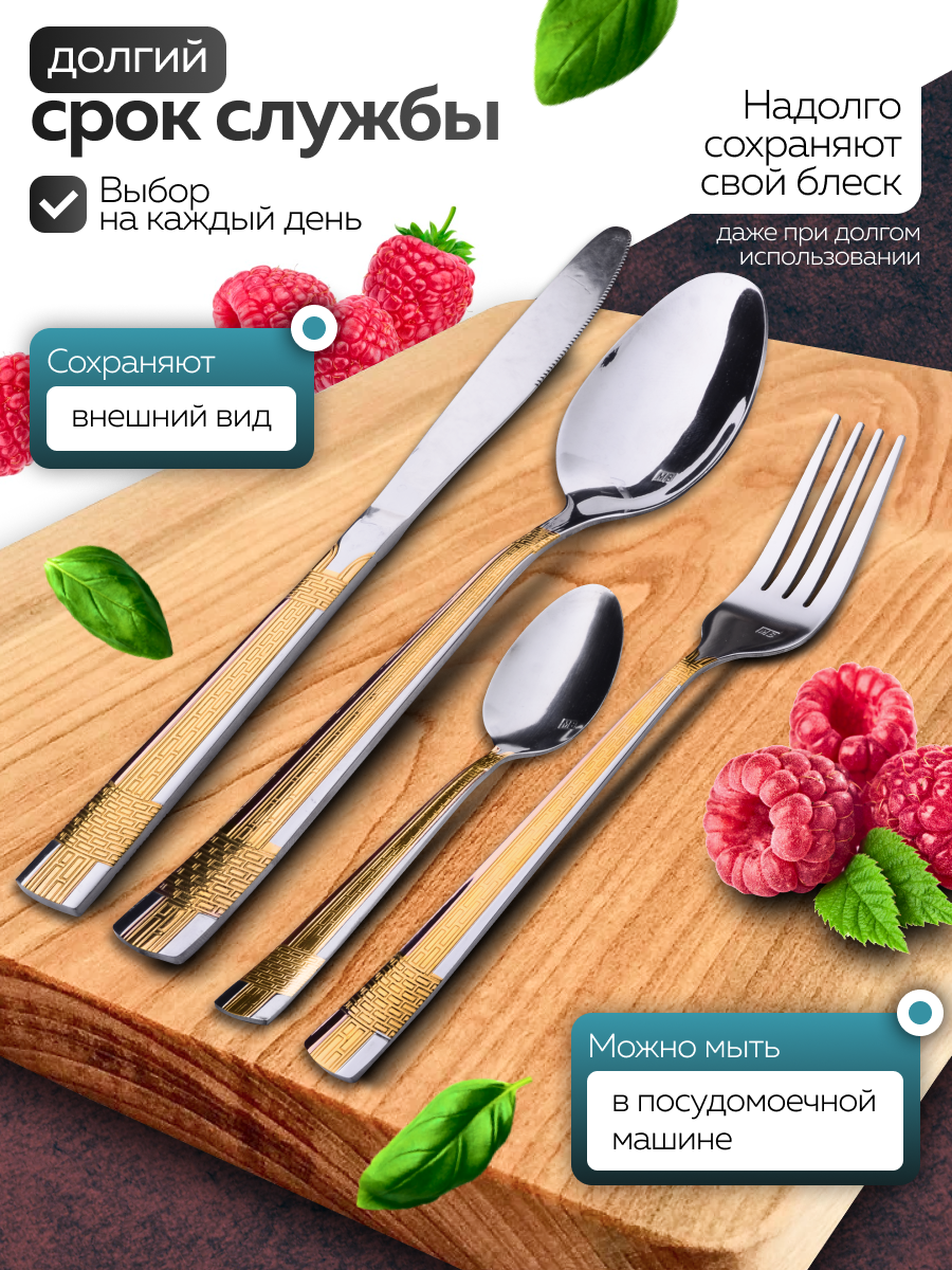 Набор столовых приборов MAYER BOCH на 6 персон выполнен из высококачественной нержавеющей стали, ручки приборов имеют глянцевую полировку и декорированы изящным золотым орнаментом. Набор из 24 х предметов включает в себя: 6 столовых ложек, 6 вилок, 6 ножей и 6 чайных ложек. Благодаря качественной полировке, изделия сохраняют прекрасный внешний вид на долгое время. Набор обладает не только оригинальным дизайном, но и практичностью, так как изделия из качественной нержавеющей стали имеют высокую прочность, устойчивость к коррозии, кроме того, нержавеющая сталь экологична, она не меняет вкусовые свойства еды, потому как не вступает в реакцию с ее компонентами. Упакованный в красочную подарочную коробку такой набор безусловно станет прекрасным подарком для любой хозяйки и украсит ваш праздничный стол. Подходит для мытья в посудомоечной машине. Характеристики: Набор столовых приборов 24пр МВ (х12). Материал: нержавеющая сталь. Рисунок: золотой орнамент. Количество: 24 шт. Размер упаковки: 36,9 х 26,7 х 5,8 см. Упаковка: коробка. Вес: 1,81 кг. Страна производитель: Китай.