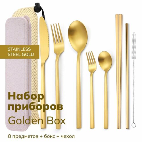 Набор столовых приборов Contemporary Golden Box из 8 предметов в футляре: включает 1 обеденный нож, 1 обеденную вилку, 1 десертную вилку, 1 столовую ложку, 1 чайную ложку, 1 пару палочек для еды, 1 прямую многоразовую соломинку, 1 щетку для соломы, упаковочный бокс и чехол.