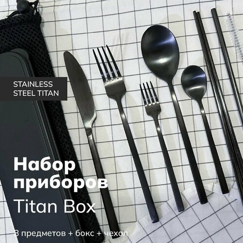 Набор столовых приборов из 8 предметов в футляре: включает 1 обеденный нож, 1 обеденную вилку, 1 десертную вилку, 1 столовую ложку, 1 чайную ложку, 1 пару палочек для еды, 1 прямую многоразовую соломинку, 1 щетку для соломы, упаковочный бокс и чехол.