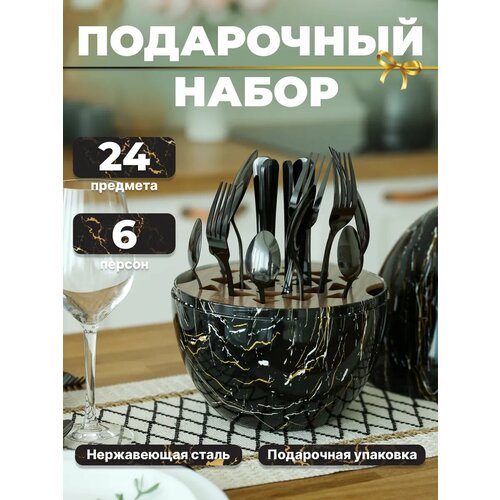 Купить Набор столовых приборов черного цвета для 6 человек, подарочный набор из 24 предметов в черном футляре-яйце под мрамор с доставкой по всей России.