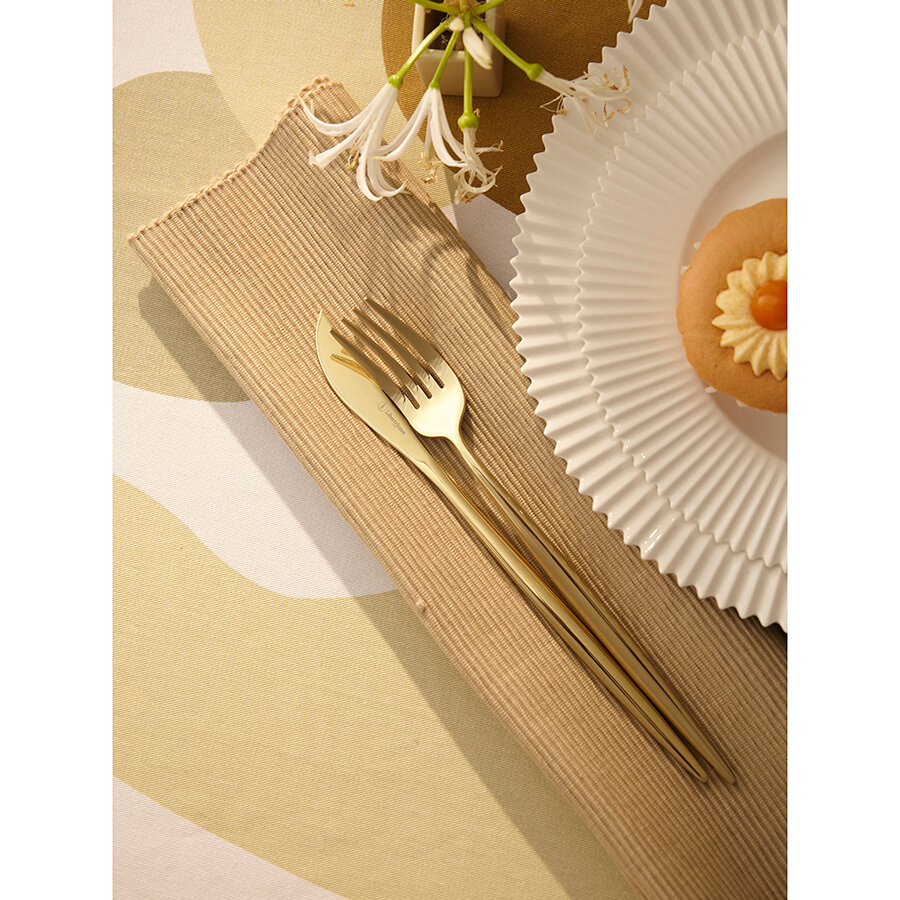 - Изделия из высококачественной нержавеющей стали 18/10 отличаются долговечностью и стойкостью к коррозии. - Лезвия ножей изготовлены из нержавеющей стали 13/0, благодаря чему обладают устойчивостью к механическим повреждениям и долго остаются острыми. - Рабочая часть приборов имеет прочное и износостойкое титановое покрытие, которое при этом является самым безопасным. - Округлые формы придают приборам элегантный и в то же время интересный вид. - Аксессуары золотистого цвета привносят в сервировку нотки роскоши и благородства.