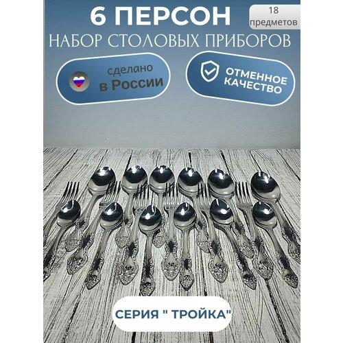 Набор столовых приборов "тройка" на 6 персон. Серия Тройка - это наиболее известная и популярная модель Павловского завода столовых приборов. В рисунке чеканки использованы элементы стиля барокко. Декоративные ручки столовых приборов выполнены методом штампованной чеканки, что говорит об уникальности производства, поскольку сталь, в отличие от мельхиора, сложно поддается каким-либо видам деформации.