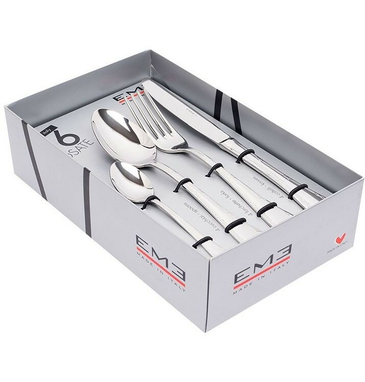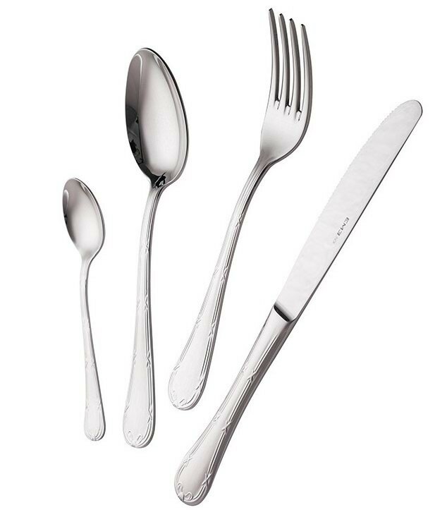 Набор EME Luigi XVI состоит из: 4 столовых ложек, 4 вилок, 4 столовых ножей и 4 чайных ложек. Все приборы изготовлены из нержавеющей стали 18/10 с зеркальной поверхностью и прекрасно подойдут для праздничной сервировки стола.