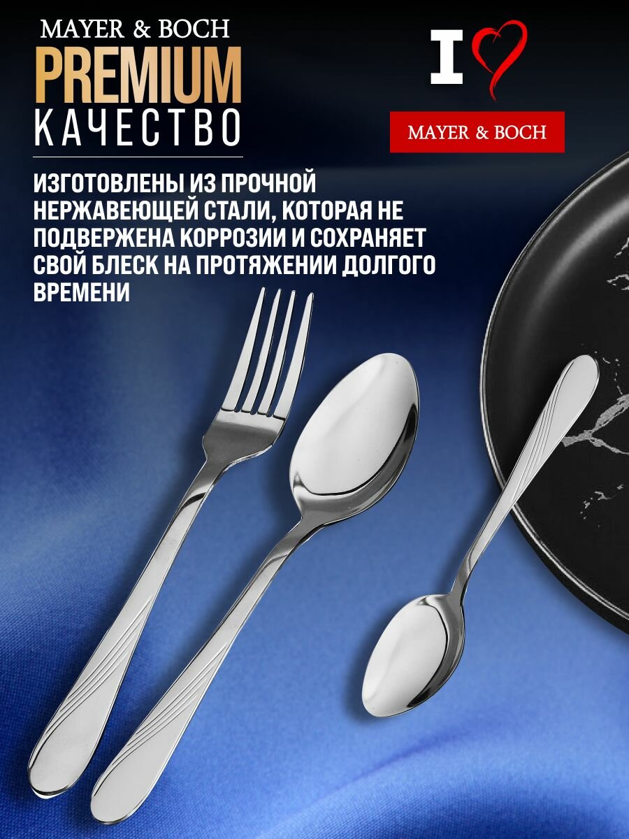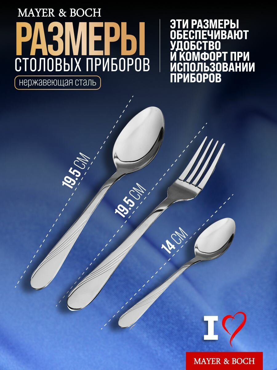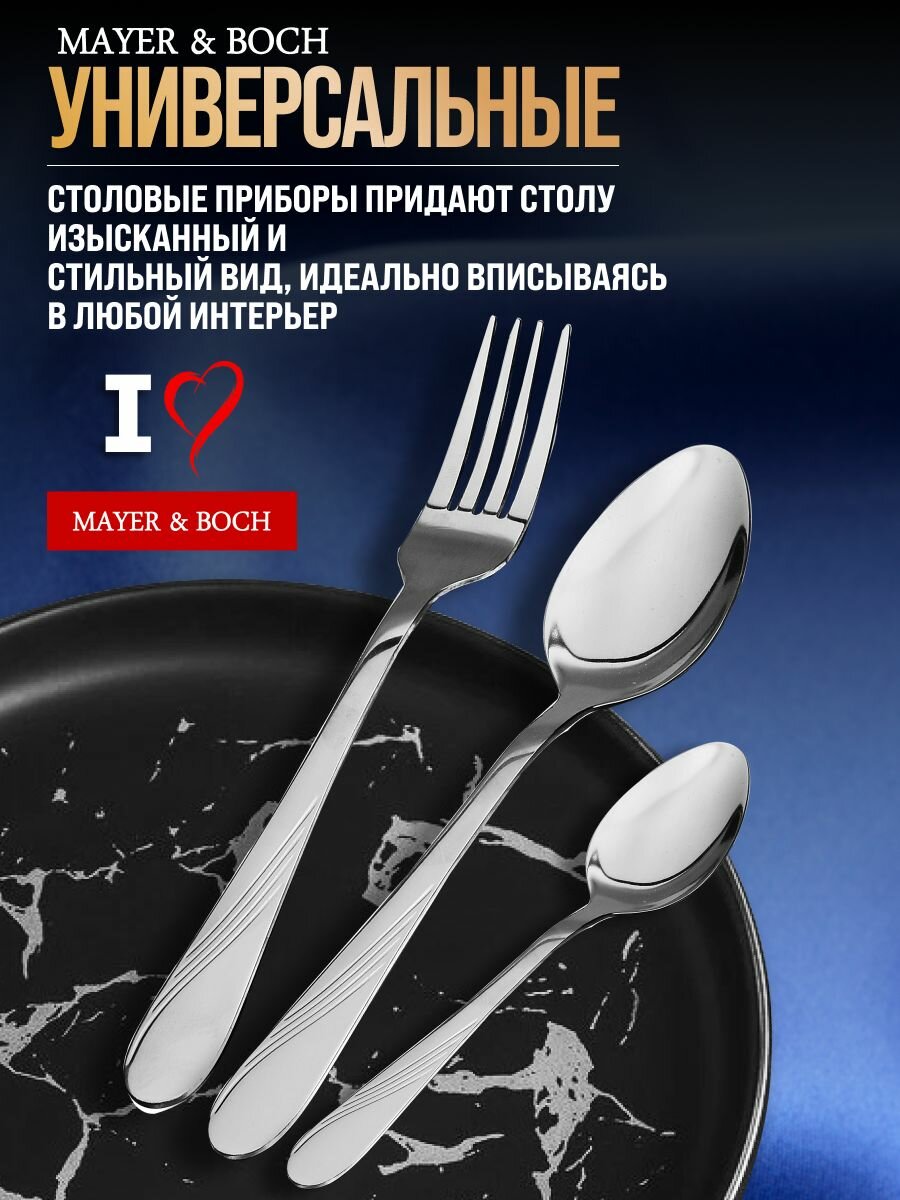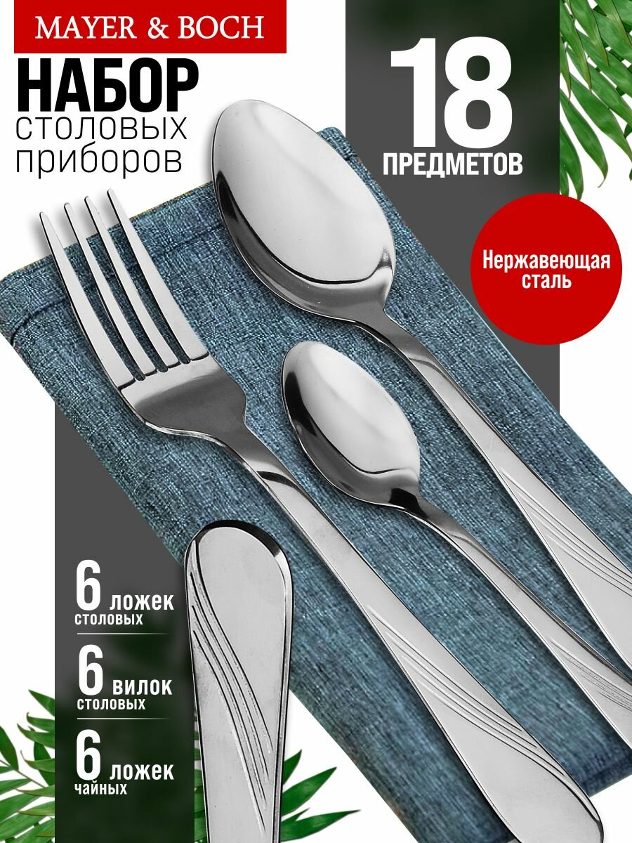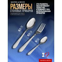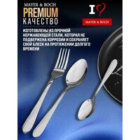 Набор столовых приборов на 6 персон от MAYER&BOCHНабор столовых приборов на 6 персон от MAYER&BOCH — это идеальный выбор для тех, кто ценит качество и элегантность. Он состоит из 18 предметов: столовые ложки - 6 шт, столовые вики - 6 шт, чайные ложки - 6 шт. Кроме того, он отличается не только высоким качеством нержавеющей стали и изысканным дизайном, но и удобством в использовании. Ручки обеспечивают комфорт при их длительном использовании, а их вес идеально сбалансирован для удобства при сервировке стола. Чаепитие или обед с друзьями станет незабываемым благодаря элегантным столовым приборам, которые добавят шарма и изыска любому столу. Также отличается прочностью и долговечностью. Вы можете быть уверены, что даже при ежедневном использовании они сохранят свой первозданный вид и качество. Благодаря высокой износостойкости покрытия, они будут выглядеть как новые долгие годы. Таким образом, покупка этого набора - это инвестиция в качественные и долговечные кухонные принадлежности, которые станут идеальным дополнением к вашему дому. Не стоит забывать и о практичности данного набора . Возможность мыть их в посудомоечной машине значительно упростит процесс уборки после приема пищи, а также сэкономит ваше время. Кроме того, красивый подарочную коробку, в котором упакован предметы, сделает его отличным подарком для ваших близких и друзей, добавляя праздничный наряд к повседневной жизни.
