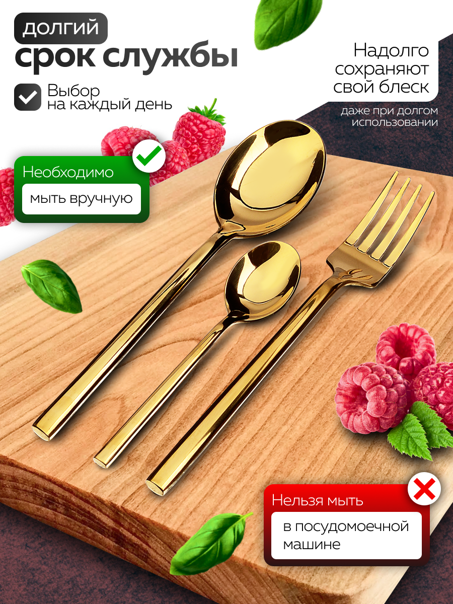 Набор столовых приборов на 6 персон от MAYER&BOCH — это идеальный выбор для тех, кто ценит качество и элегантность. Он состоит из 24 предметов позолоченых покрыием: столовые ложки - 6 шт, столовые вики - 6 шт, соловые ножи - 6 шт, чайные ложки - 6 шт. Кроме того, он отличается не только высоким качеством нержавеющей стали и изысканным дизайном, но и удобством в использовании. Ручки обеспечивают комфорт при их длительном использовании, а их вес идеально сбалансирован для удобства при сервировке стола. Чаепитие или обед с друзьями станет незабываемым благодаря элегантным столовым приборам, которые добавят шарма и изыска любому столу. Также отличается прочностью и долговечностью. Вы можете быть уверены, что даже при ежедневном использовании они сохранят свой первозданный вид и качество. Благодаря высокой износостойкости покрытия, они будут выглядеть как новые долгие годы. Таким образом, покупка этого набора - это инвестиция в качественные и долговечные кухонные принадлежности, которые станут идеальным дополнением к вашему дому. Не стоит забывать и о практичности данного набора . Возможность мыть их в посудомоечной машине значительно упростит процесс уборки после приема пищи, а также сэкономит ваше время. Кроме того, красивый подарочную коробку, в котором упакован предметы, сделает его отличным подарком для ваших близких и друзей, добавляя праздничный наряд к повседневной жизни.
