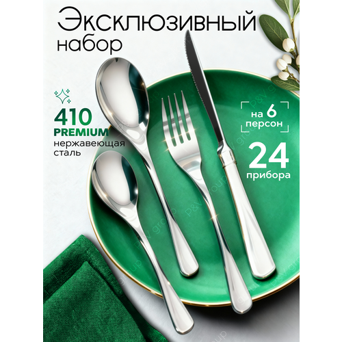 Набор столовых приборов из нержавеющей стали предназначен для 6 персон и включает в себя 24 предмета.