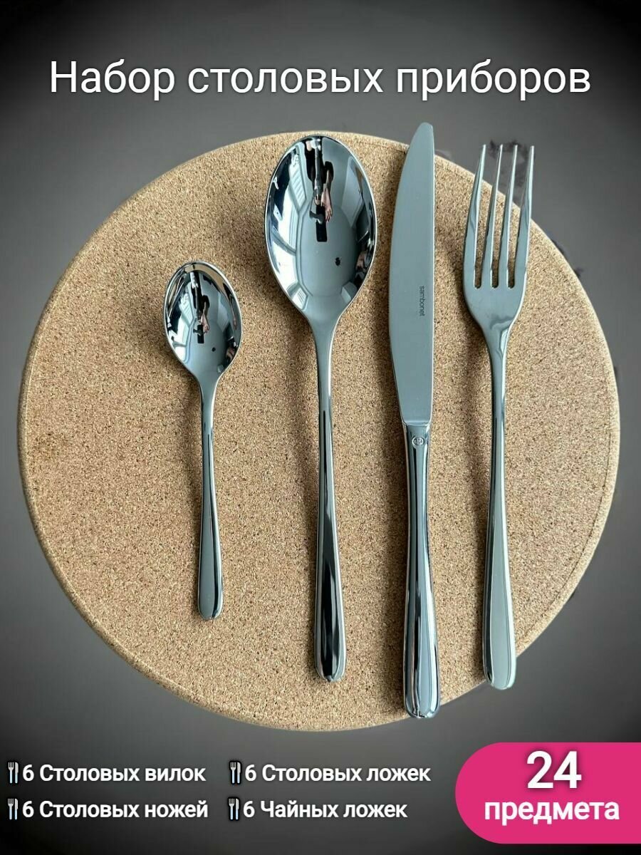 Набор столовых приборов Sambonet - это комплект из 24 предметов, включающий в себя 6 столовых ложек, 6 столовых вилок, 6 столовых ножей и 6 чайных ложек. Этот набор посуды из нержавеющей стали идеально подходит для столовой или кухни в доме, а также для сервировки стола на садовых вечеринках. Кухонные и столовые принадлежности в этом наборе изготовлены из нержавеющей стали, что делает их прочными и долговечными. В комплект также входит сервировочный нож и вилка, которые прекрасно подойдут для обеденной сервировки.
