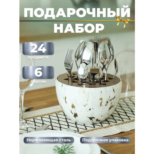 Набор столовых приборов серебристого цвета для 6 человек, подарочный набор из 24 предметов в белом футляре-яйце под мрамор: сравнение цен, характеристики, фото, актуальное наличие и цены.