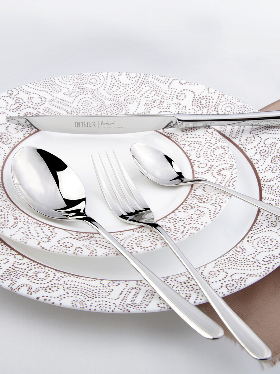 Описание Столовый прибор (кроме лезвий ножей) изготовлен из высококачественной нержавеющей стали марки 18/10: прочен и устойчив к деформации; обладает высокими антикоррозийными свойствами; устойчив к воздействию кислот и щелочей; не изменяет вкусовые качества, запах и цвет пищи, т. к. не вступает реакцию с ее компонентами; легко моетсяЛезвия ножей выполнены из высококачественной легированной стали марки 420S37 (2Cr>13): максимально прочны и устойчивы к деформации; обладают высокими антикоррозийными свойствами; устойчивы к притуплениюСпециальные утолщения на местах наибольшего износа приборов: способствуют увеличению срока службы; препятствуют деформацииОтлично сбалансированные ручки приборов позволяют приборам удобно ложиться в руку. Приборы TalleR отличают идеальная обработка края и высокое качество полировки. Набор пригоден для мытья в посудомоечной машине (кроме столовых ножей). «Набор столовых приборов нержавеющая сталь, 24 предмета, подарочная упаковка, Taller, TR-21603»