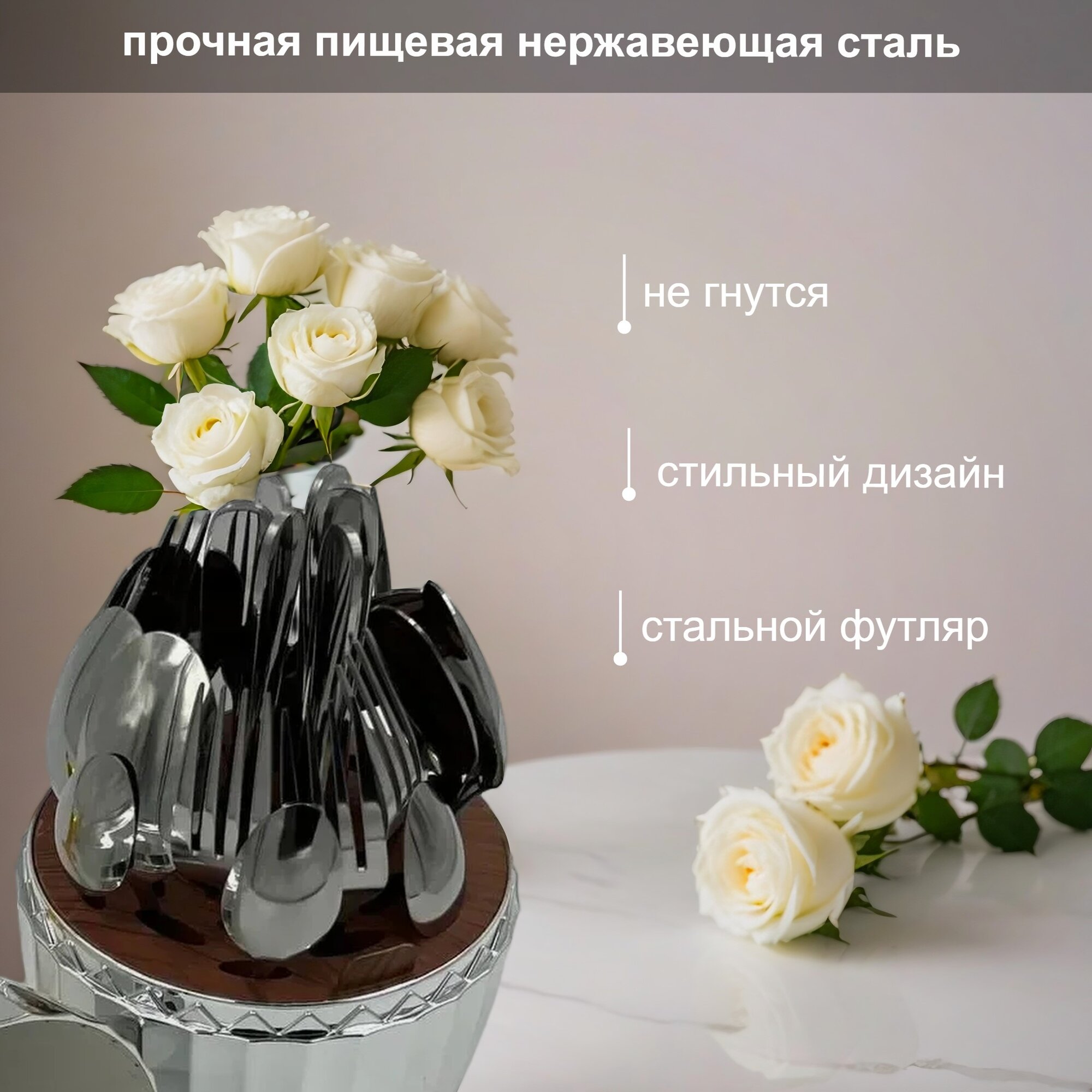 Хотите удивить подарком? Что подарить руководителю, коллеге, учителю, маме, на юбилей? Ответ на все эти вопросы прост: Набор столовых приборов. Уникальный подарочный набор столовых приборов в подставке выполнен из высококачественной нержавеющей стали. В состав набора столовых приборов ножи, вилки, ложки столовые, ложки чайные на 6 персон + удобная эргономичная подставка для столовых приборов. Подарочный набор кухонных принадлежностей зеркально отполирован, не окисляется, сохраняет свой блеск очень долго. Набор столовых принадлежностей упакован в плотную подарочную коробку идеален для подарка маме, бабушке, девушке, подруге, коллеге, знакомым, на новоселье, новый год, день рождения. Ножи, ложки и вилки будут идеальным элементом сервировки стола к особому случаю и для повседневного использования. Столовые приборы легки в уходе их также можно мы в посудомоечной машине. А подставка для столовых приборов решит проблему с хранением ложек, вилок и ножей на Вашей кухне. Набор столовых предметов на 6 персон идеален в качестве подарка на день учителя.