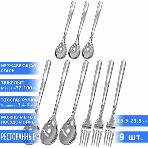В набор входят: чайная ложка длиной 15.5 см, массой ≈ 32 гр, шириной ≈ 29 мм и толщиной ручки ≈ 3.4 мм - 3 шт; столовая ложка длиной 21.5 см, массой ≈ 100 гр, шириной ≈ 41 мм и толщиной ручки ≈ 6 мм - 3 шт; столовая вилка длиной 21.5 см, массой ≈ 70 гр, шириной ≈ 23 мм и толщиной ручки ≈ 6 мм - 3 шт.