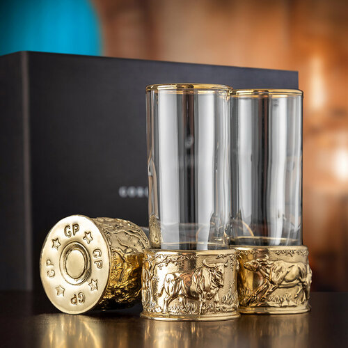Размеры: Размер стопки: диаметр 45 мм, высота 112 мм. Вес 200гр. Объем 60мл. Основной материал: Латунь/Стекло Детали: В наборе 3 стопки, подарочная коробка