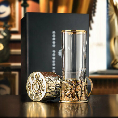 Размеры: Размер стопки: диаметр 45 мм, высота 112 мм, вес 200г, объем 60 мл Основной материал: Латунь/Стекло Детали: В наборе 2 стопки патрон в подарочной коробке