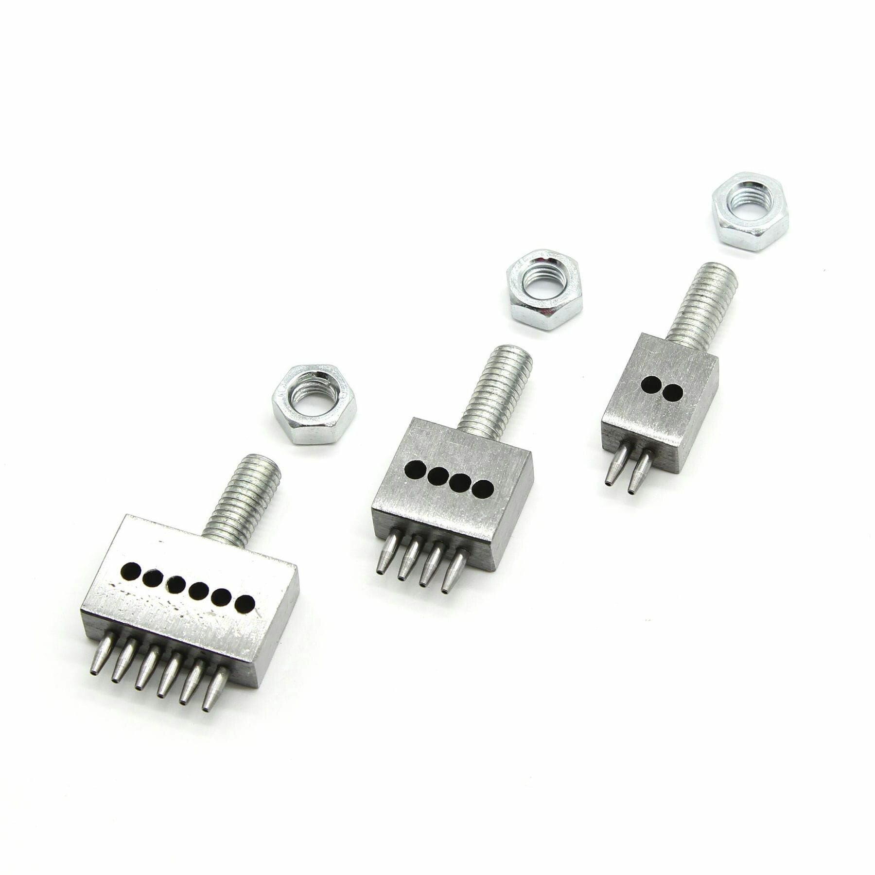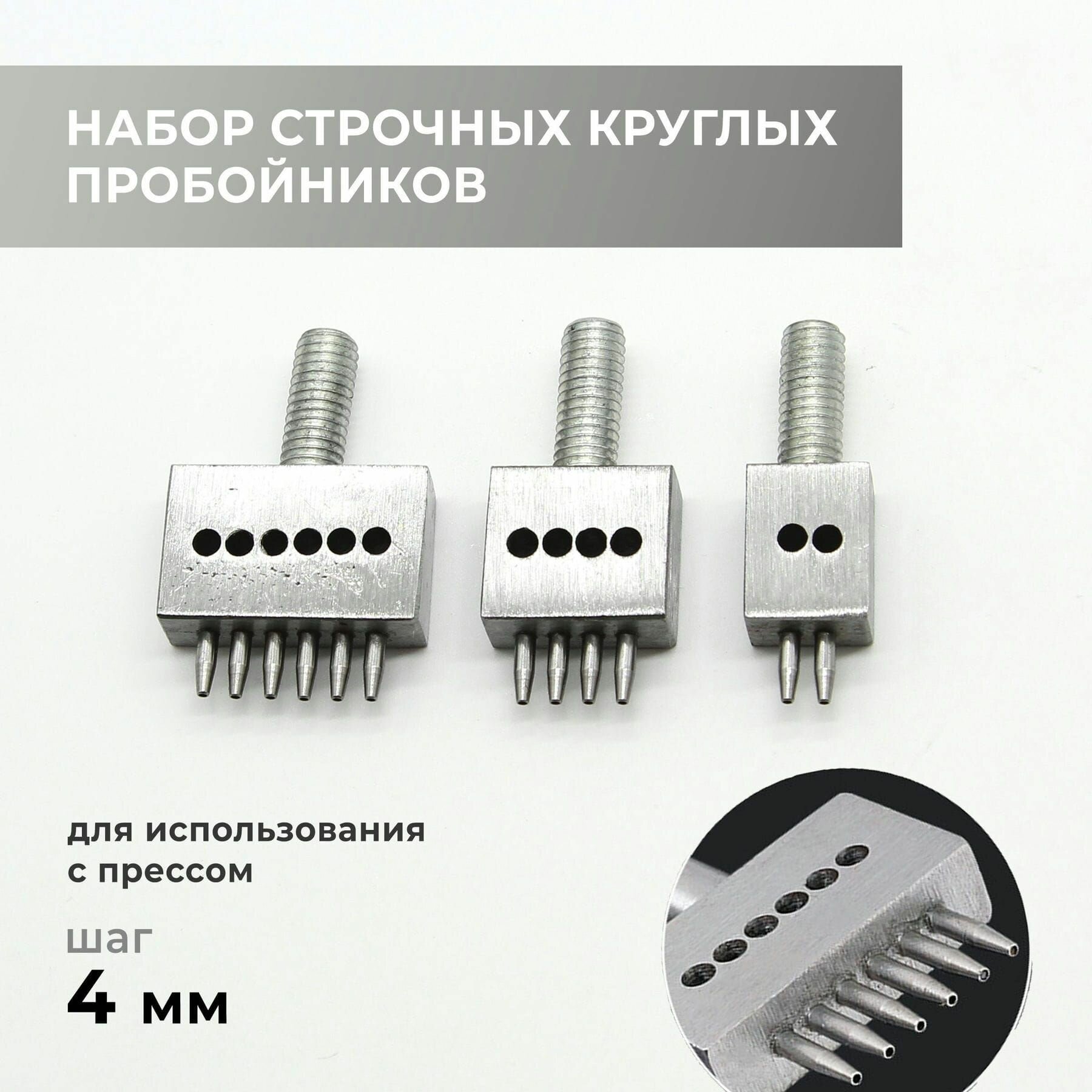 Строчные шаговые пробойники предназначены для пробивания в коже аккуратных и равноудаленных друг от друга отверстий под шов. Круглые строчные пробойники для китайского пресса позволяют сделать классическую прямую строчку. Диаметр резьбы 8 мм, форма зуба круглая, диаметр входного отверстия 1 мм, в набор кожевника входят три дырокола для кожи на 2,4 и 6 зубов. Шаг 4 мм. Данный набор для кожевенного дела обязательно пригодится при работе с кожей. Примечание: не подходит к прессам тер-2. Для использования с прессом тер-2 можно приобрести переходник М8/М6.