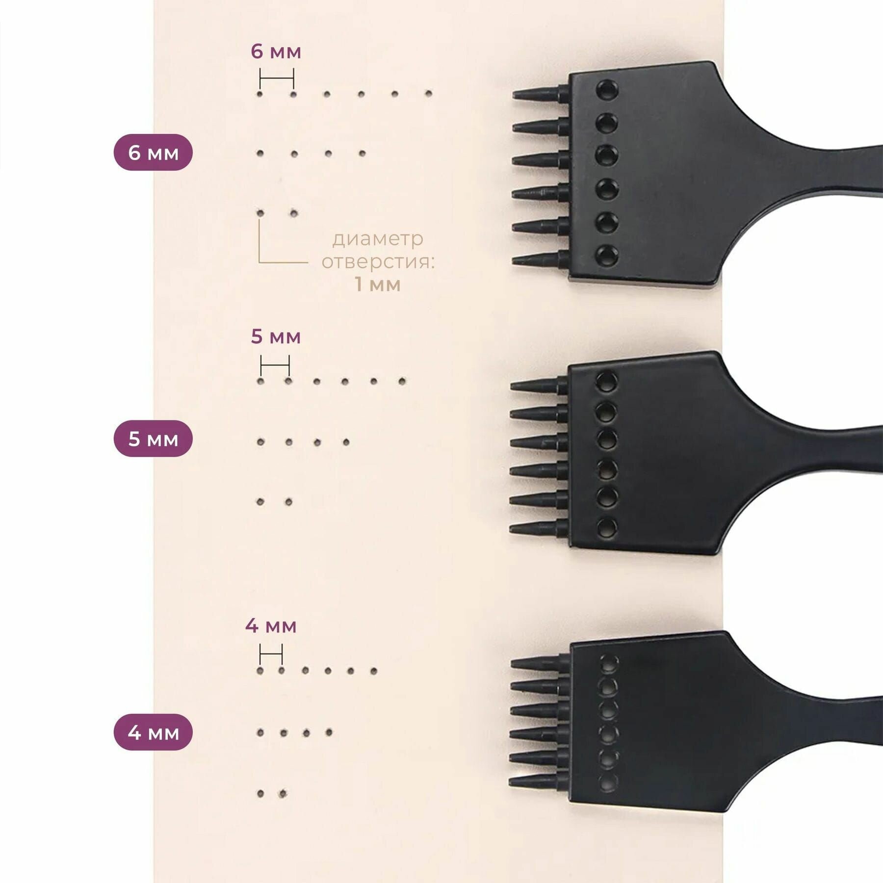 Строчные шаговые пробойники предназначены для пробивания в коже аккуратных и равноудаленных друг от друга отверстий под шов. Круглые строчные пробойники позволяют сделать классическую прямую строчку. Форма зуба дырокола для кожи круглая, диаметр входного отверстия 1мм, в набор входят пробойники на 2,4 и 6 зубов. Шаг 4 мм.