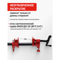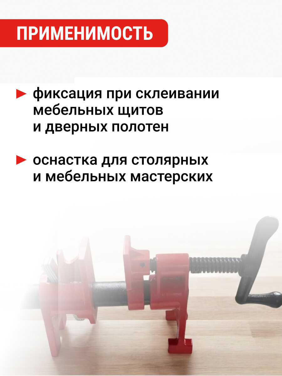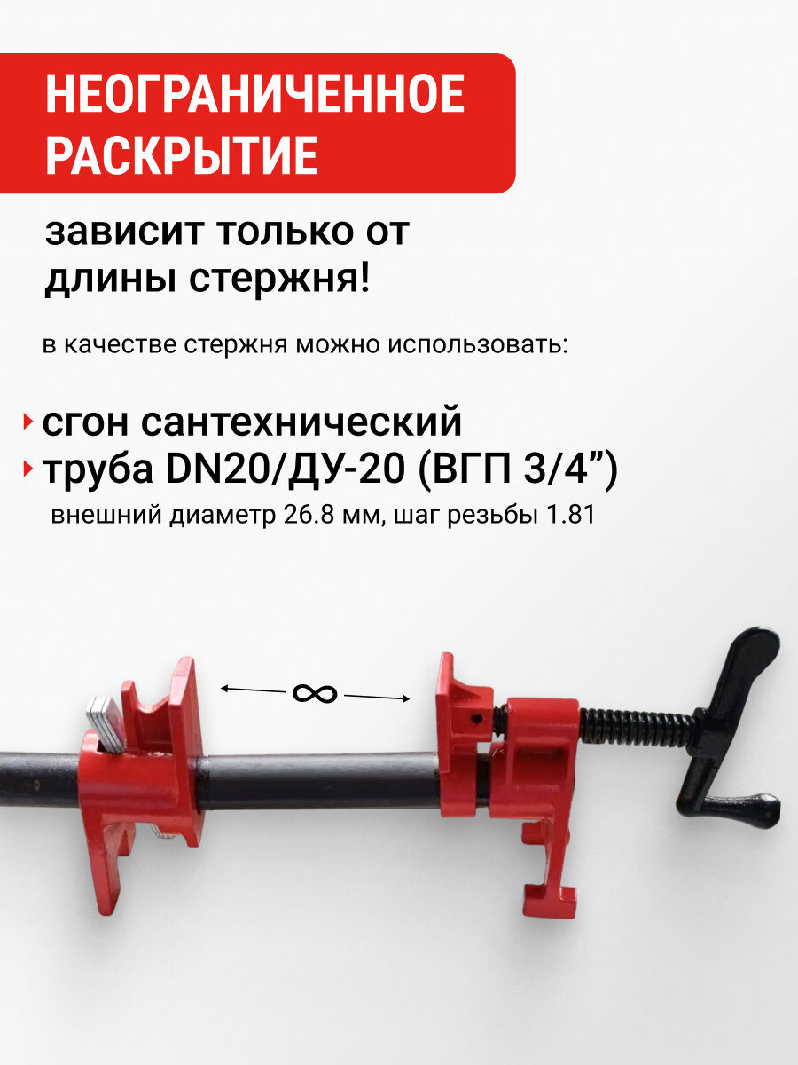 У трубной струбцины отсутствует внутренний стержень, благодаря чему увеличивается раскрытие струбцины и расширяются возможности ее применения: от склейки мебели до монтажа деталей автомобиля. Вместо внутреннего стержня используется стальная водогазопроводная труба диаметром 26,8 мм. Благодаря этому размер деталей для фиксации ограничивается только длиной трубы, которую вы устанавливаете в струбцину. Затяжной Т-образный винт уменьшает усилие вращения и обеспечивает быструю надежную затяжку заготовок. Струбцина выдерживает большие нагрузки и дает возможность удерживать большое давление. Резиновые прокладки на губках предохраняют предмет от вмятин, а благодаря наличию в конструкции ножек струбцина более устойчивая.