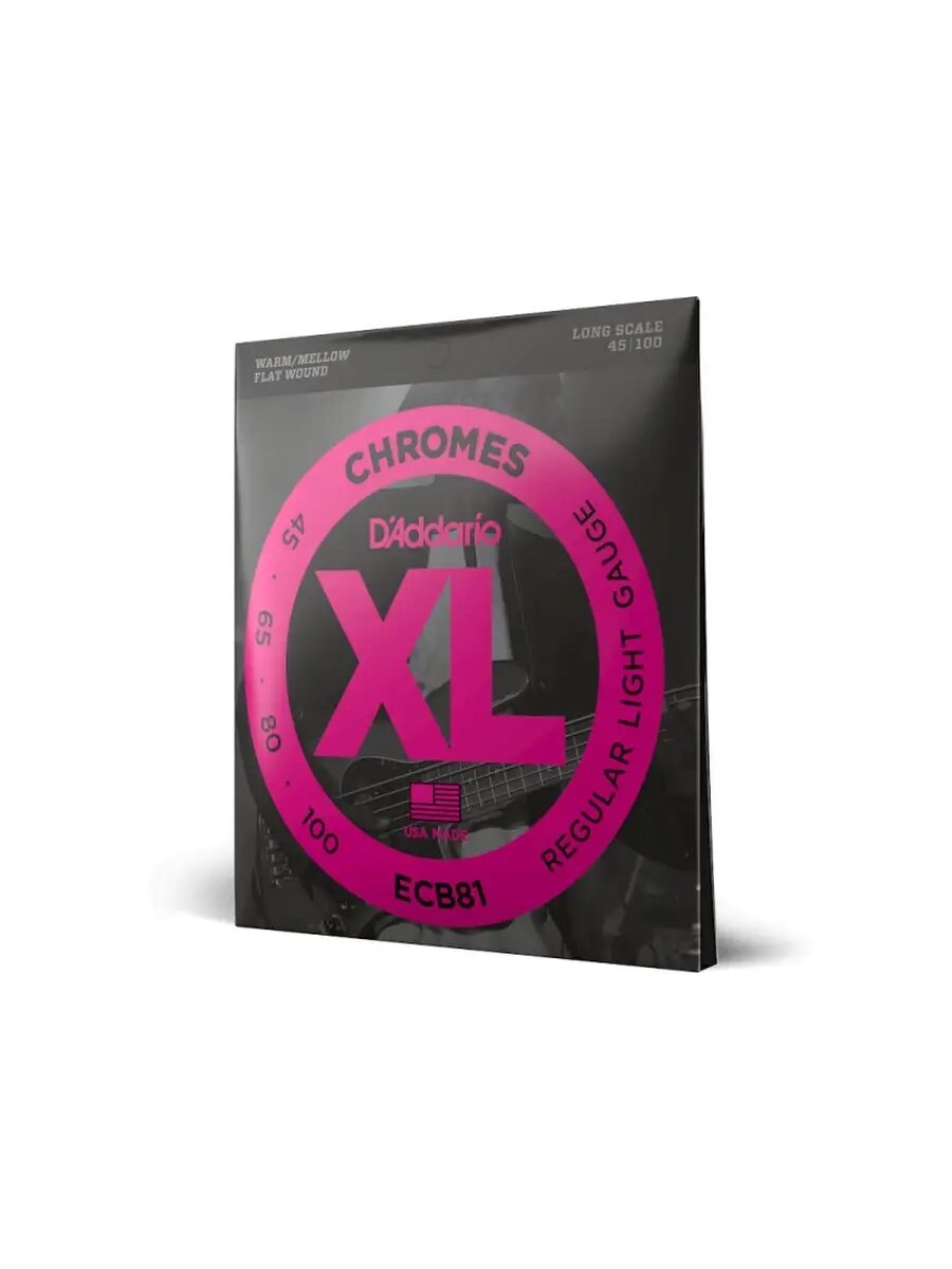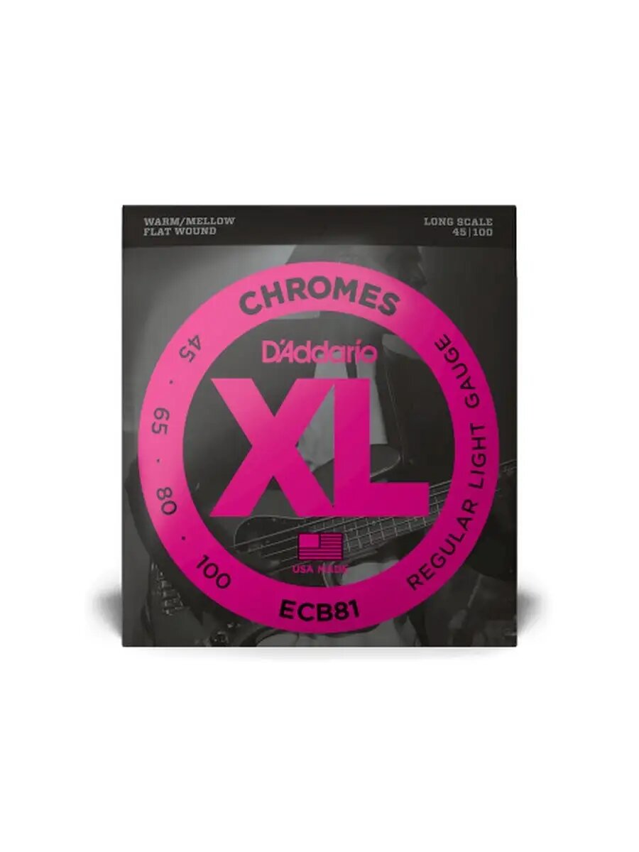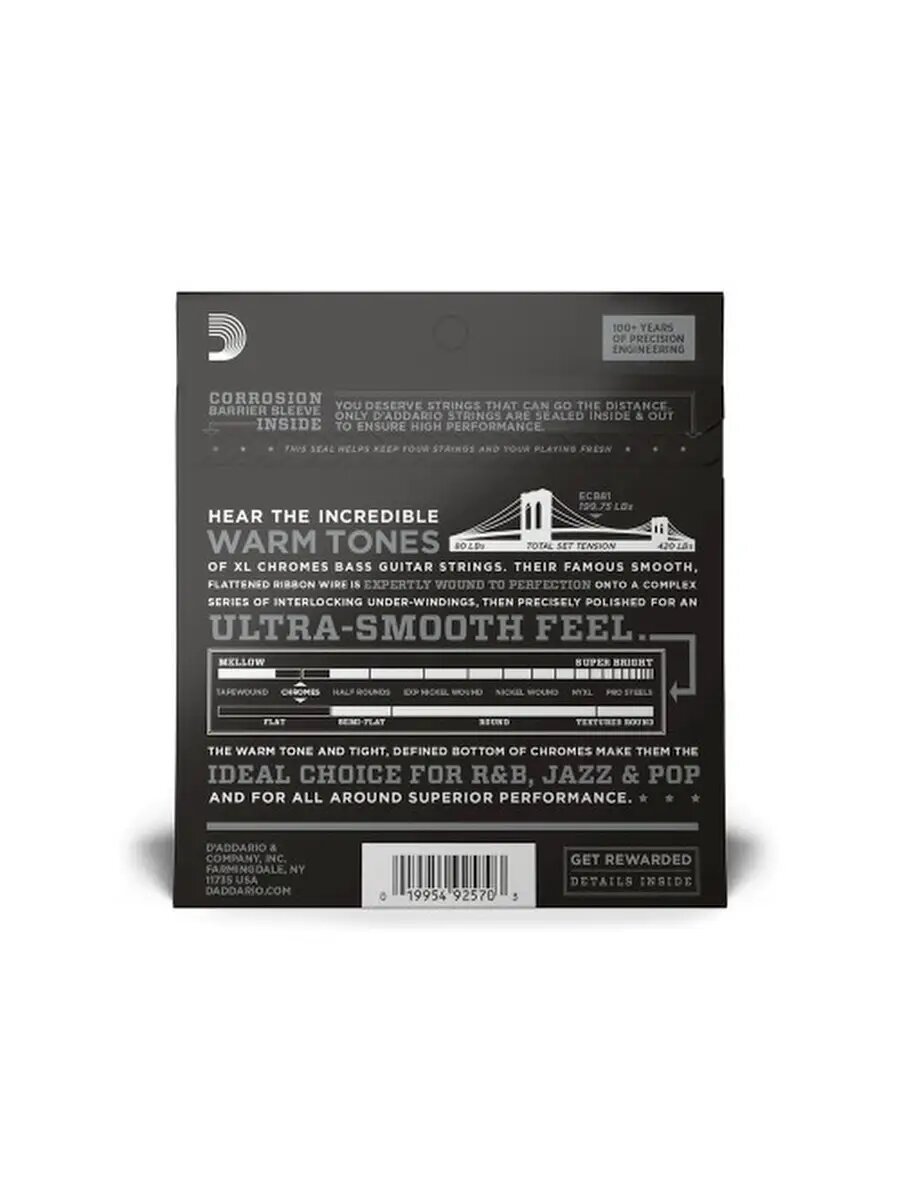 Струны D'Addario серии Chromes Bass выполняются в обмотке из плоской нержавеющей стальной ленты, отполированной до создания невероятно гладкой поверхности. Струны D'Addario Chromes обеспечивают отчетливо демпфированное, но богатое тонами звучание, характерное только для струн с плоской обмоткой и являются самыми популярными в мире струнами с плоской обмоткой.