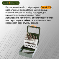 Расширенный набор свёрл серии «Cobalt 5%» малого диаметра, рассчитанных для работы с материалами высокой твёрдости. Легирование кобальтом обеспечивает более высокую термостойкость, что значительно продлевает срок службы сверла. Крестообразно подточенная вершина и угол заточки 135° обеспечивают самоцентрирование, что снижает возможность «хождения» сверла при засверливании и уменьшает нагрузки при сверлении.