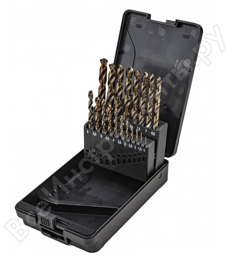 Сверло по металл HSS-Co 19 шт: 1 мм, 1.5 мм, 2 мм, 2.5 мм, 3 мм, 3.5 мм, 4 мм, 4.5 мм, 5 мм, 5.5 мм, 6 мм, 6.5 мм, 7 мм, 7.5 мм, 8 мм, 8.5 мм, 9 мм, 9.5 мм, 10 мм.