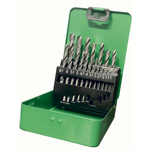 Набор сверл по металлу с цилиндрическим хвостовиком в металлическом кейсе из 19-ти предметов. Класс точности В1. Материал: быстрорежущая сталь Р6М5. В состав набора входят сверла 1.0 До 10.0 мм с шагом 0.5 мм.