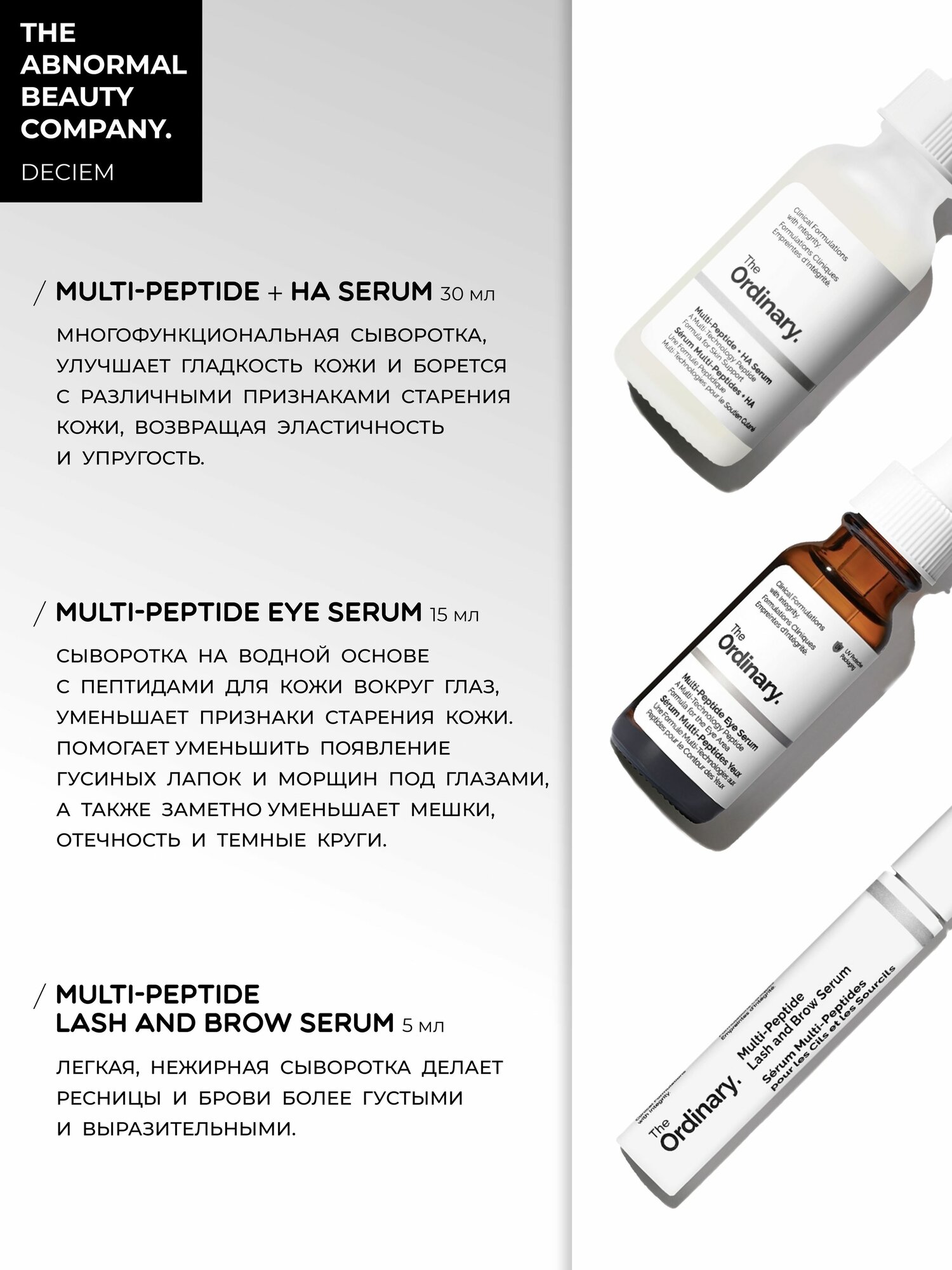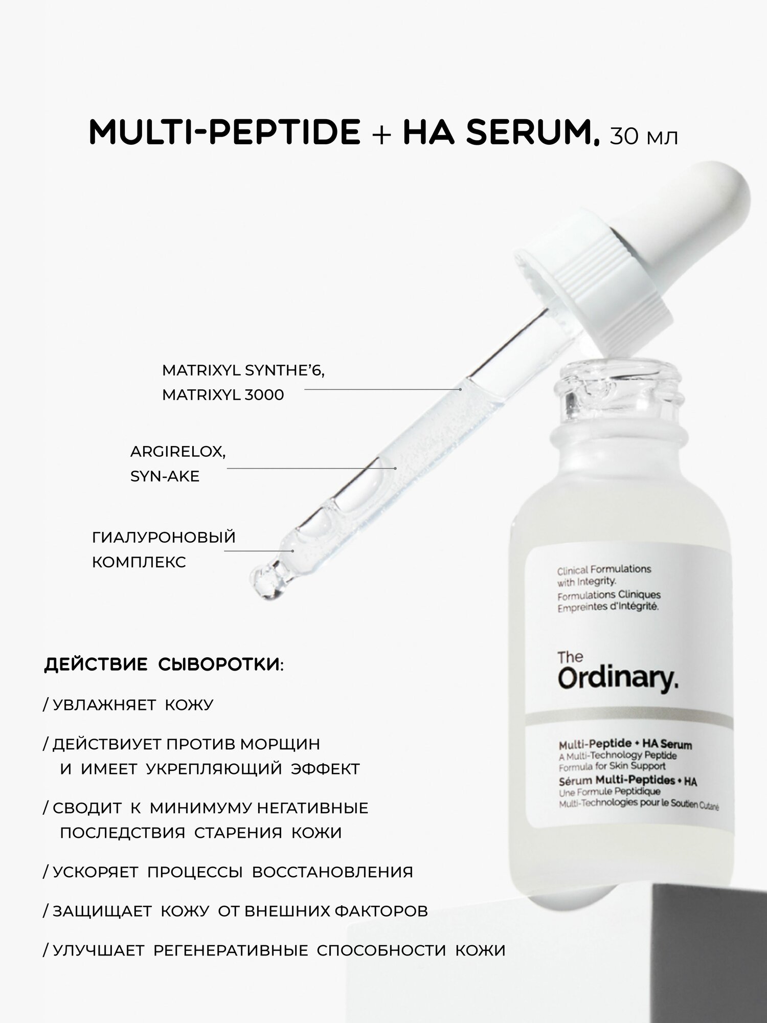 Multi-Peptide + HA Serum (30мл) — это многофункциональная сыворотка, которая улучшает гладкость кожи и борется с различными признаками старения кожи, включая ощущение эластичности и упругости. В его состав входят 4 хорошо изученные пептидные технологии — Matrixyl Synthe’6, Matrixyl 3000, SYN-AKE и ARGIRELOX — и полезные для кожи аминокислоты с несколькими типами комплексов гиалуроновой кислоты.