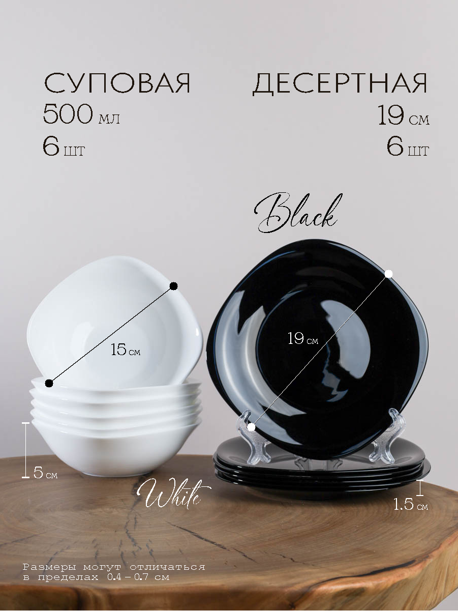 Тарелка десертная 6 шт, черные: ширина – 19 см, высота – 1,5 см. Тарелка суповая, белая: 500 мл, ширина – 15 см, высота – 5 см.