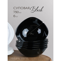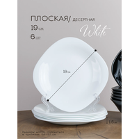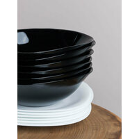 Тарелка десертная 6 шт, белая: ширина – 19 см, высота – 1,5 см. Тарелка суповая, черная: 750 мл, ширина – 17 см, высота – 6 см.