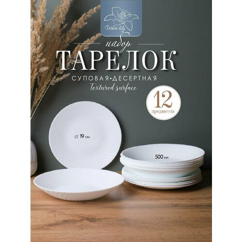 Набор в 12 предметов, белый с фактурной поверхностью состоит из: - тарелка обеденная - 6 шт, диаметр 19 см; высота 1,7 см; - тарелка глубокая суповая - 6 шт, объем - 500 мл; диаметр 20 см; высота 3 см;