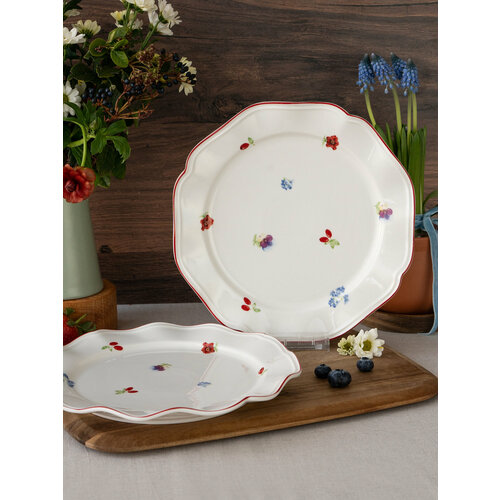 Изготовленные из высококачественного белого фарфора, они отличаются прочностью, гладкой глянцевой поверхностью и приятной на ощупь лёгкостью, несмотря на солидный диаметр. Фирменный волнистый край придаёт изделиям мягкую, винтажную выразительность, подчёркивая внимание к деталям и уникальность дизайна.