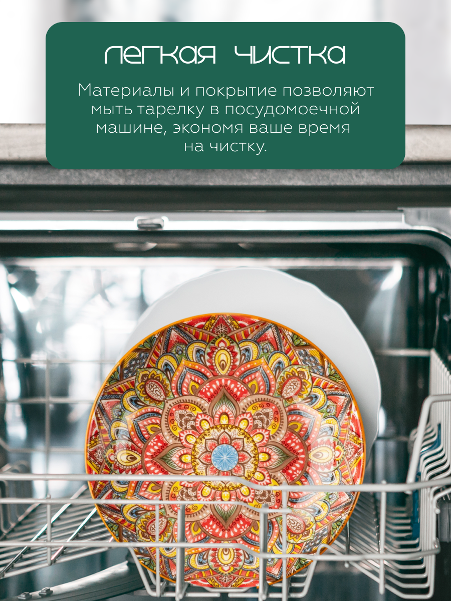 Восточная сказка на Вашем столе! Взрыв красок, симфония форм, танец узоров – все это объединилось невероятно выразительной керамической тарелке Homium Kitchen Multi серии Мехроб. Тарелка с традиционным узбекским орнаментом стилизована под национальный ляган для подачи восточного плова, бешбармака и других блюд. Посуда станет идеальным фоном для блюда, подчеркнув его насыщенный вкус и аромат.