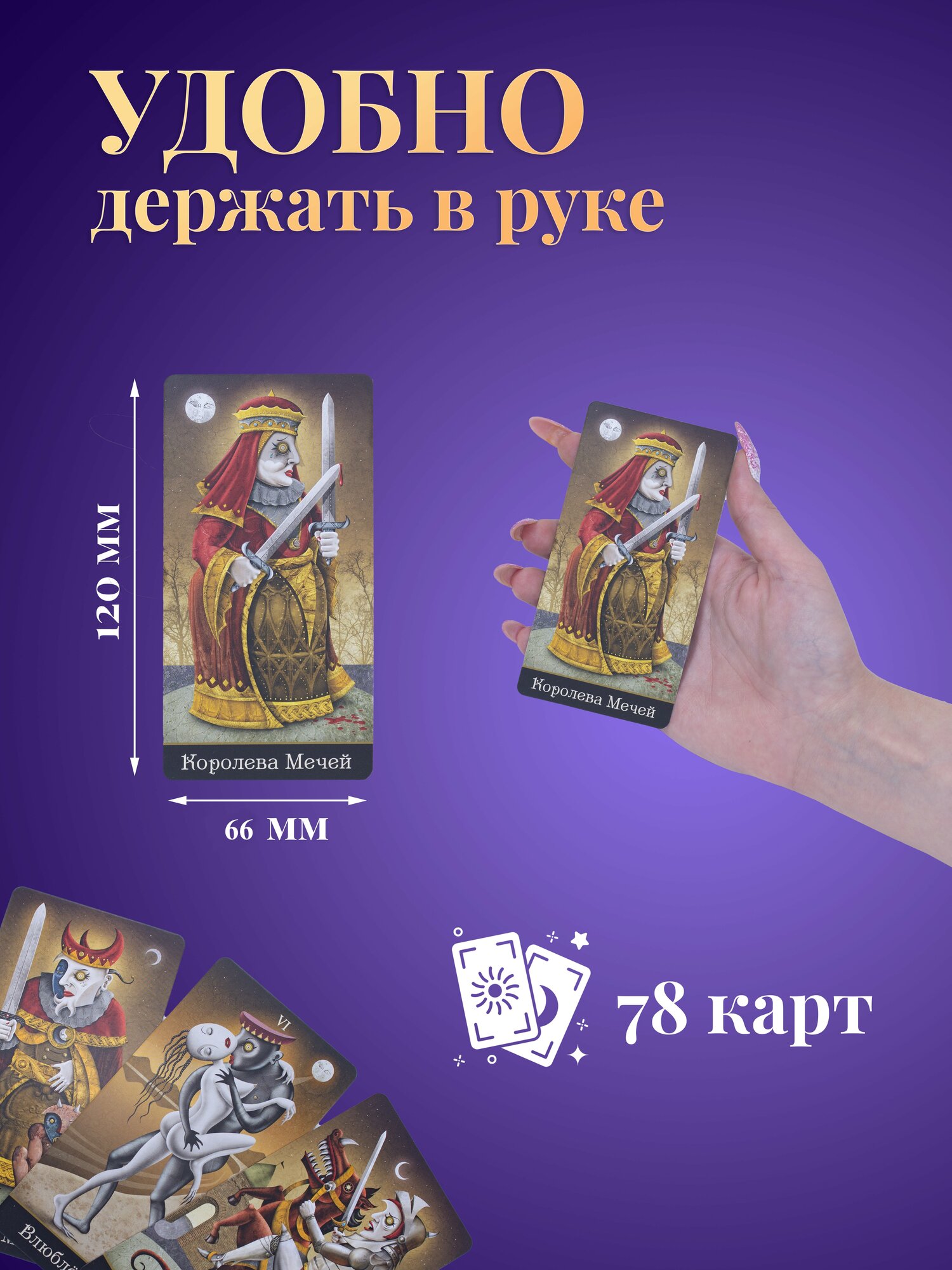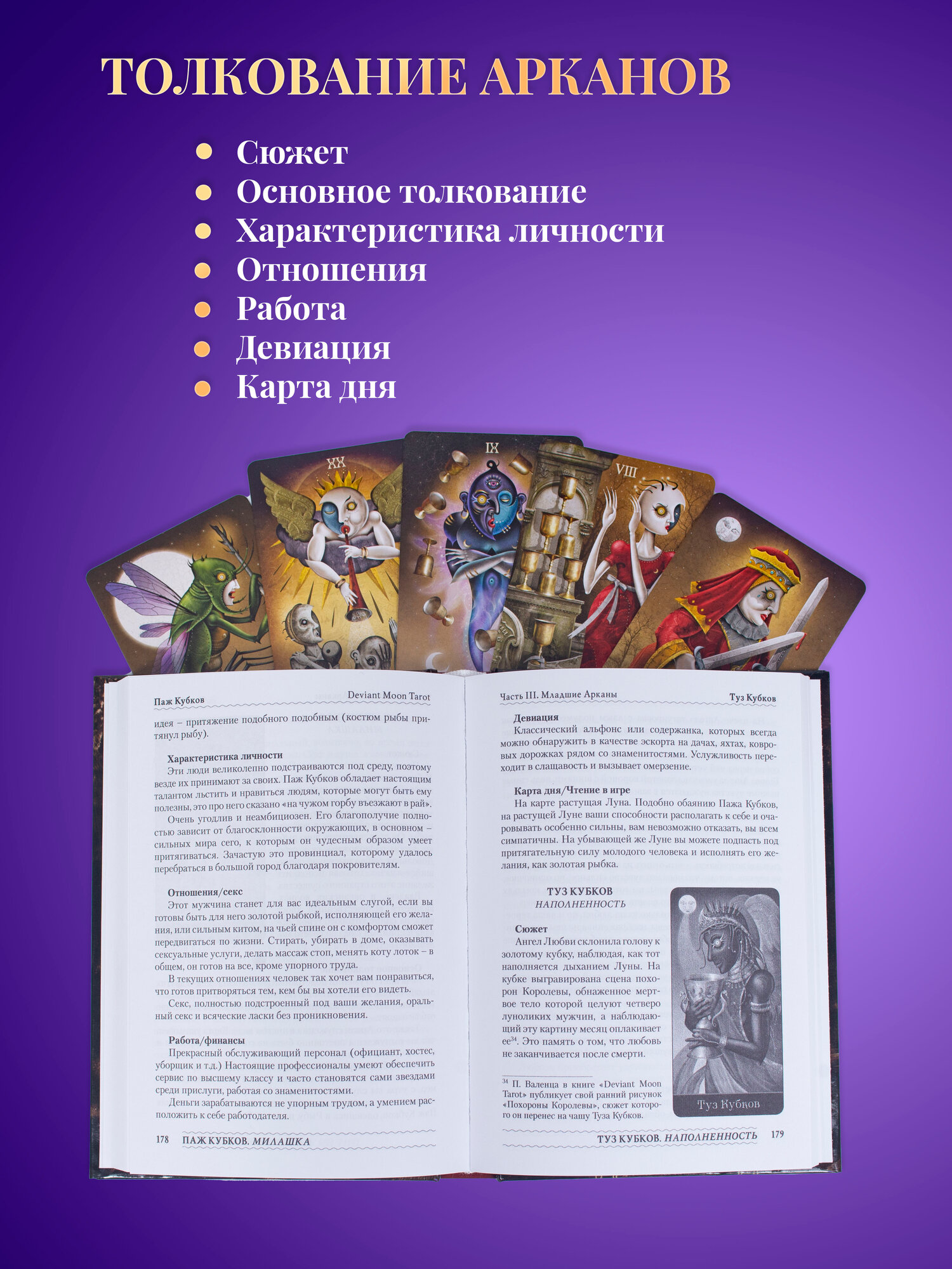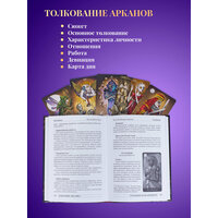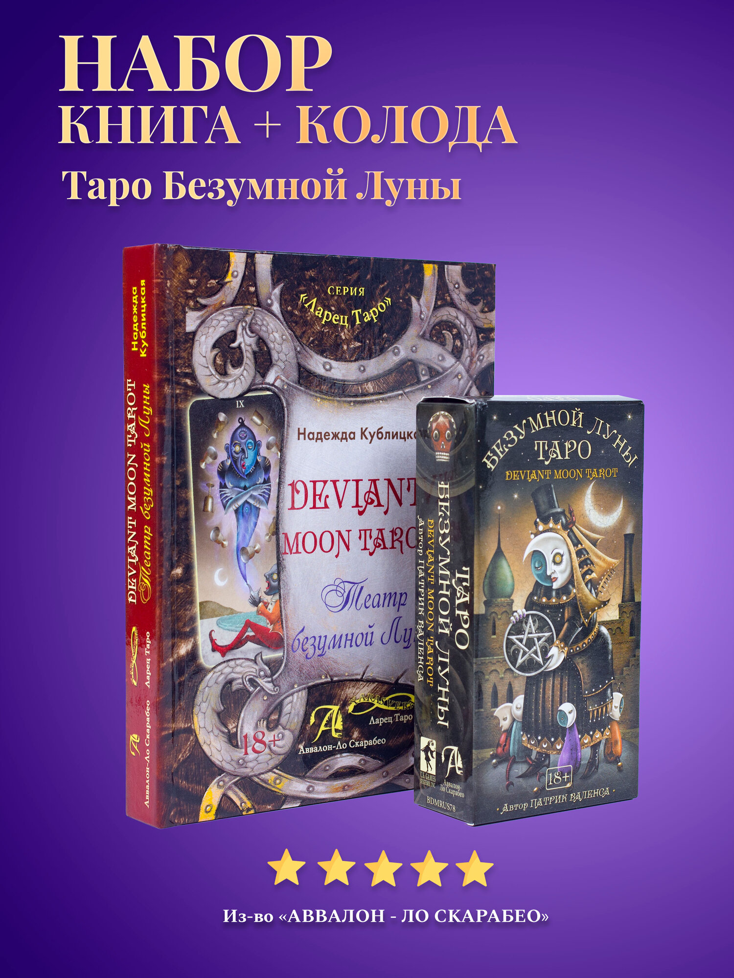 | Подробная комплектация | Колода с инструкцией по QR-коду 80 карт: 78 карт Таро + 2 информационные карты.22 Старших Аркана и 56 Младших Арканов. + Книга ТЕАТР БЕЗУМНОЙ ЛУНЫ от Надежды Кублицкой |