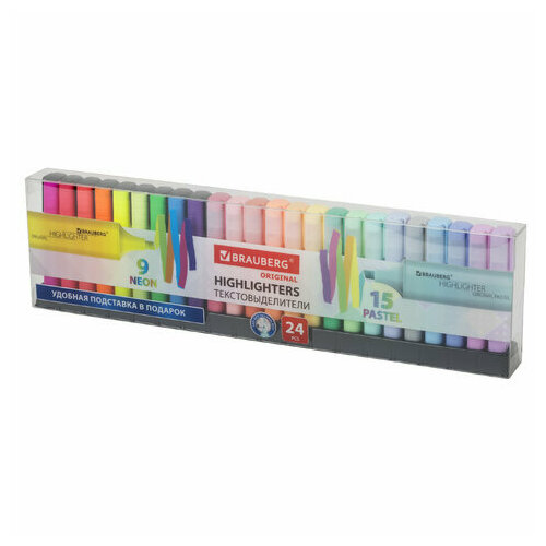 Текстовыделители BRAUBERG "ORIGINAL" предназначены для выделения текста на бумаге любого типа. Идеально подходят для учебных, домашних и офисных задач. 24 цвета в наборе: 9 неоновых – желтый, синий, зеленый, розовый, оранжевый, фиолетовый, светло-зеленый, красный, светло-оранжевый и 15 пастельных цветов – мятный, лавандовый, бирюзовый, персиковый, ванильный, пастельный розовый, коралловый, серый, небесно-голубой, золотой, винный, фуксия, аквамариновый, лаймовый, пастельный сиреневый. Неоновый цвет позволяет ярко выделить важное в тексте, а особый пастельный оттенок создает мягкие переходы и равномерно подчеркивает необходимую информацию. В комплекте – подставка длиной 43 см, которая позволяет удобно расположить набор на столе и обеспечить быстрый доступ к каждому текстовыделителю. Текстовыделители имеют корпус прямоугольной формы шириной 25 мм. Скошенный наконечник обеспечивает толщину линии письма от 1 до 5 мм, что удобно при работе с текстом, напечатанным мелким шрифтом, или таблицами. Благодаря особой водной основе чернил текстовыделители не высыхают без колпачка в течение 8 часов. Текстовыделители обладают экономным расходом чернил, при этом длина линии письма достигает 300 метров. Чернила быстро впитываются и не размазываются. Цвет корпуса соответствует цвету чернил. Цвет чернил: ассорти. Количество в комплекте: 24 шт. Форма наконечника: скошенный. Спецэффект цвета чернил : неоновый, пастельный. Основа чернил: водная. Серия: Original. Мин. толщина линии письма: 1 мм. Макс. толщина линии письма: 5 мм. Форма корпуса: прямоугольная. Диаметр корпуса: 25 мм. Наличие клипа: да. Упаковка: пластиковый футляр с европодвесом Бренд - BRAUBERG. Производитель - Китай. Артикул - 152508. Штрихкод - 4606224411255