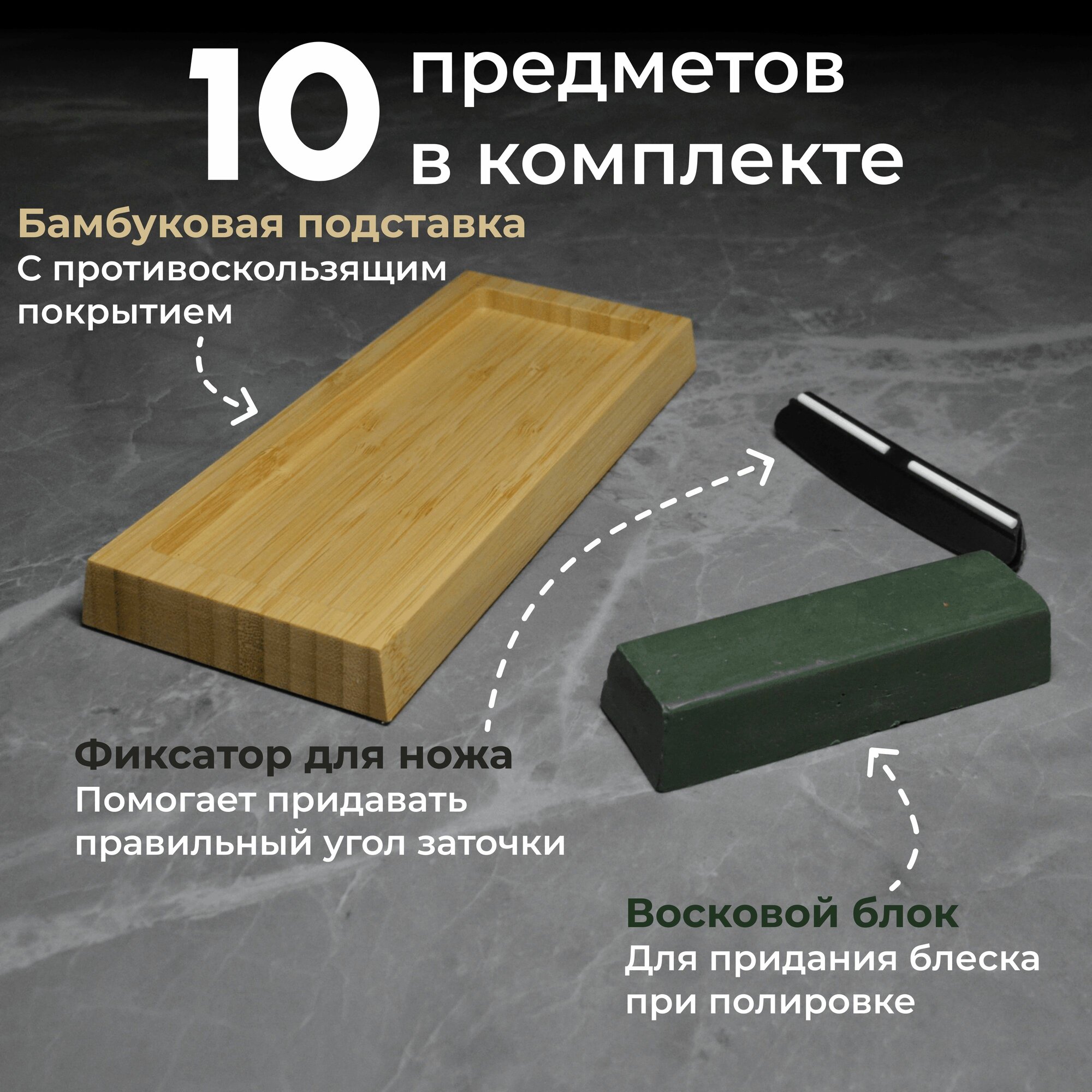 В комплекте есть всё необходимое для удобной заточки и полировки ножей, а также корректирующий камень для выравнивания поверхности точильного камня.