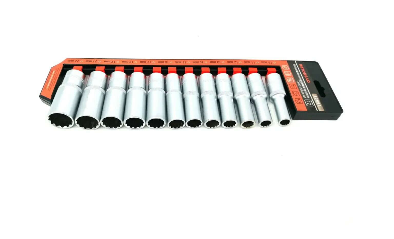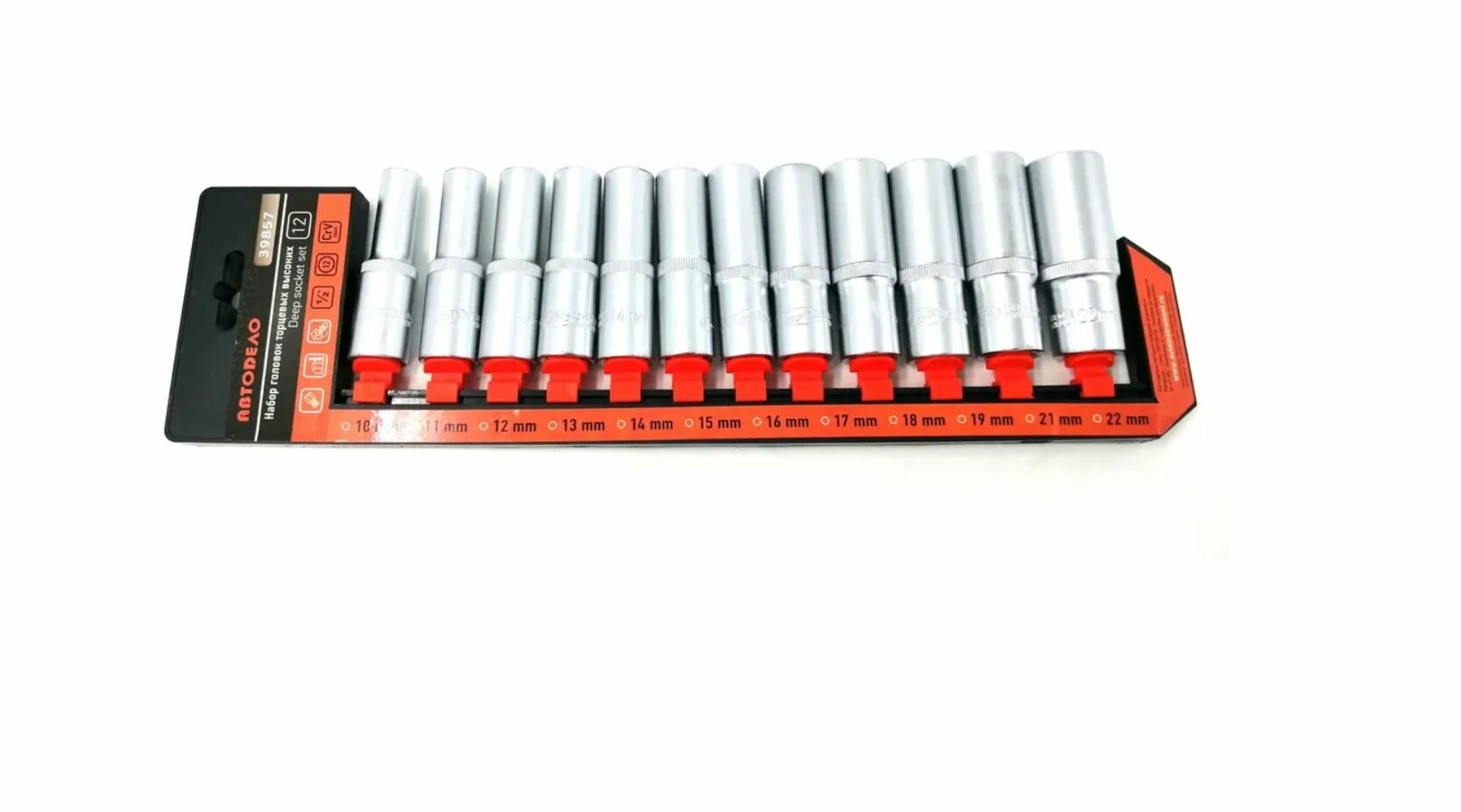 Набор торцевых головок высоких 12-ти гранных, 1/2, 10-22 мм, 12 шт. 39857 15444 АвтоDело. Головки торцевые 10 11 12 13 14 15 16 17 18 19 21 22 мм. Характеристики: Тип крепления: квадрат с подпружиненным шариком, Тип головки: торцевая, Количество: 12 шт, Размер посадки: 1/2 дюйма, Ударная: нет, Материал: CrV, Глубокая: да, Внутренний шестигранник: нет, Наружный шестигранник: нет, Крест: нет, Шлиц: нет, Внутренний TORX торкс торекс : нет, Наружный TORX торкс торекс : нет, Наружный SPLINE: нет, Внутренний двенадцатигранник: да, Вес нетто: 1. 62 кг, Габариты без упаковки: 110х60х375 мм