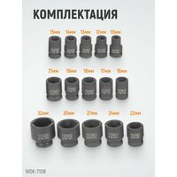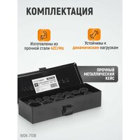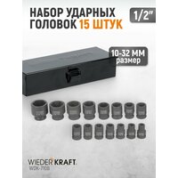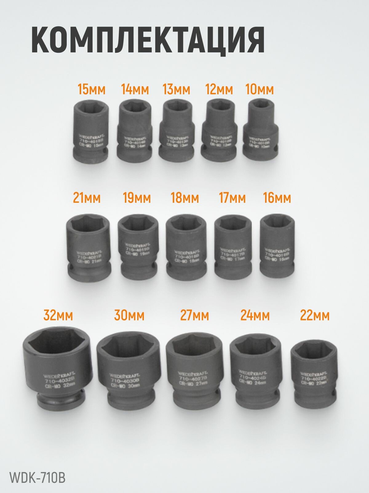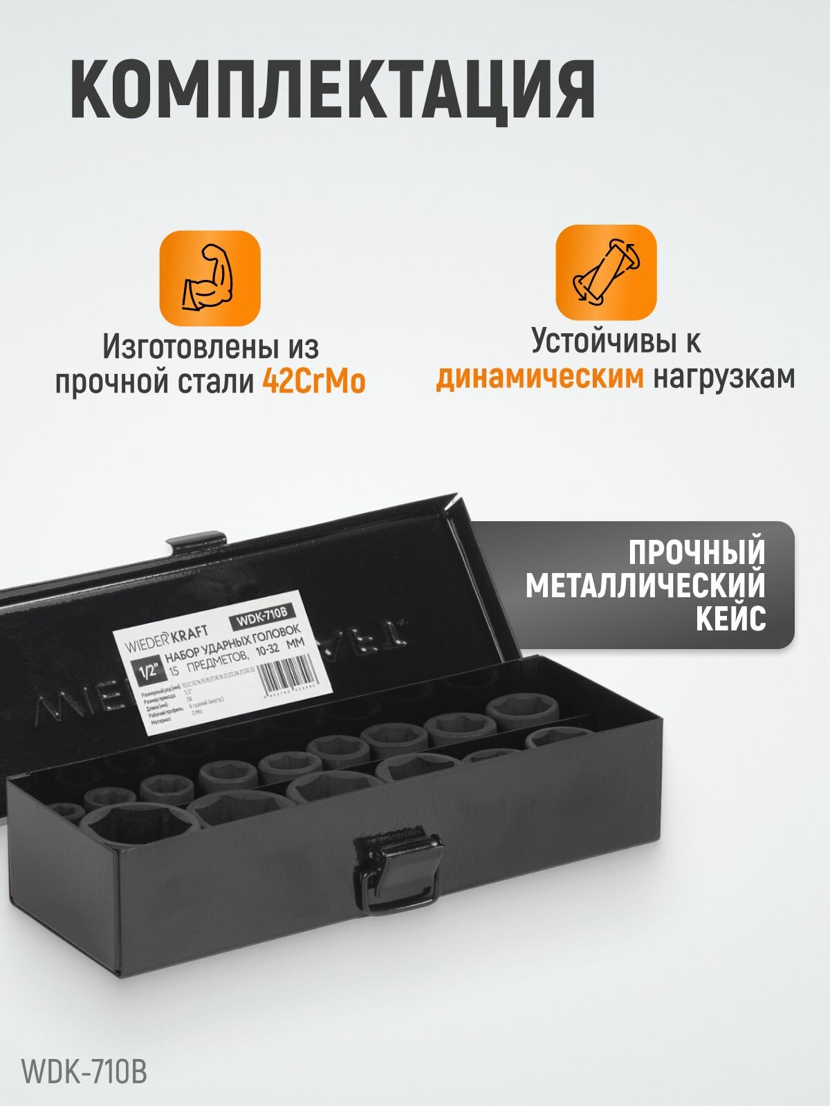 Набор ударных головок WiederKraft WDK-710B – профессиональный комплект для работы с крепежными элементами с помощью ударного гайковерта. Включает 15 шестигранных головок (10–32 мм) с посадочным квадратом 1/2″, изготовленных из прочной хром-молибденовой стали 42CrMo. Специальный профиль нагрузки вне угла предотвращает скругление граней крепежа, обеспечивая надежный захват и долгий срок службы инструмента. Головки поставляются в металлическом кейсе с надежной защелкой из нержавейки для удобного хранения и транспортировки.