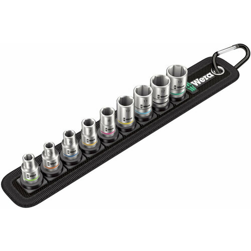 Пояс из прочной материи (пояс) с типичным дизайном Wera и 9 головок в компактном размещении. Поворотный механизм с лёгким ходом служит для надёжной фиксации и лёгкого извлечения головок. С идентификаторами инструментов "Take it easy" с цветовой кодировкой размера для простого и быстрого нахождения нужного инструмента. Включая карабин для крепления на ремне или сумке. Задняя сторона на липучках и полоска на липучках для простого крепления, например, на стене, полке, инструментальной тележке и системе переноски инструментов Wera 2go.