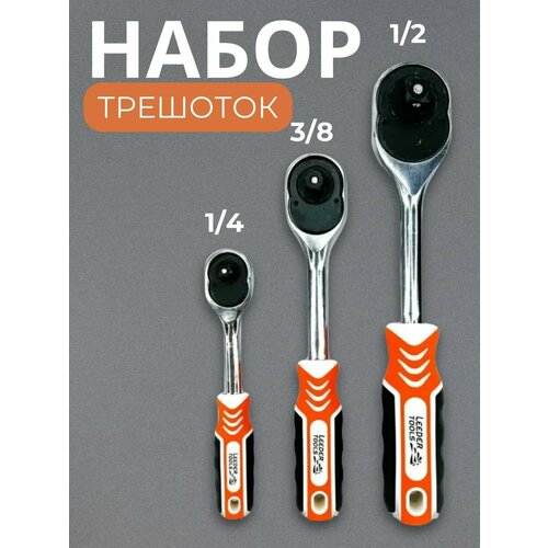 Трещотка для головок (набор инструментов с посадочными квадратами 1/2, 3/8 и 1/4) представляет собой комплект универсальных инструментов, необходимых для проведения работ с автомобилем. Набор включает трещотки с посадочными квадратами различных размеров: 1/2, 3/8 и 1/4. Они изготовлены из высокопрочной хромованадиевой стали, которая прошла термическую обработку и покрытие для защиты от коррозии. Ключи трещотка под головки имеют противоскользящее покрытие, обеспечивающее удобный хват во время работы. Храповый механизм с переключателем позволяет плавно менять направление вращения ключа. Такой набор инструментов будет полезен как для профессиональных механиков, так и для любителей, занимающихся ремонтом автомобилей в свободное время.