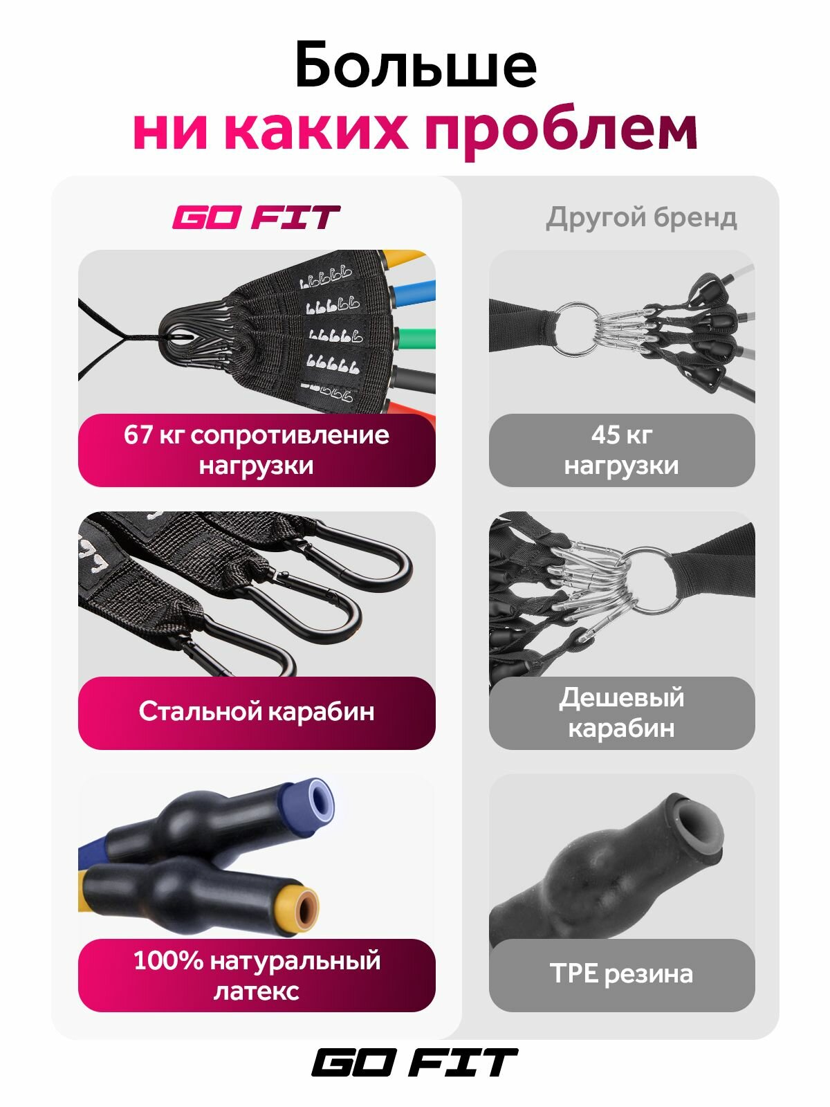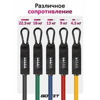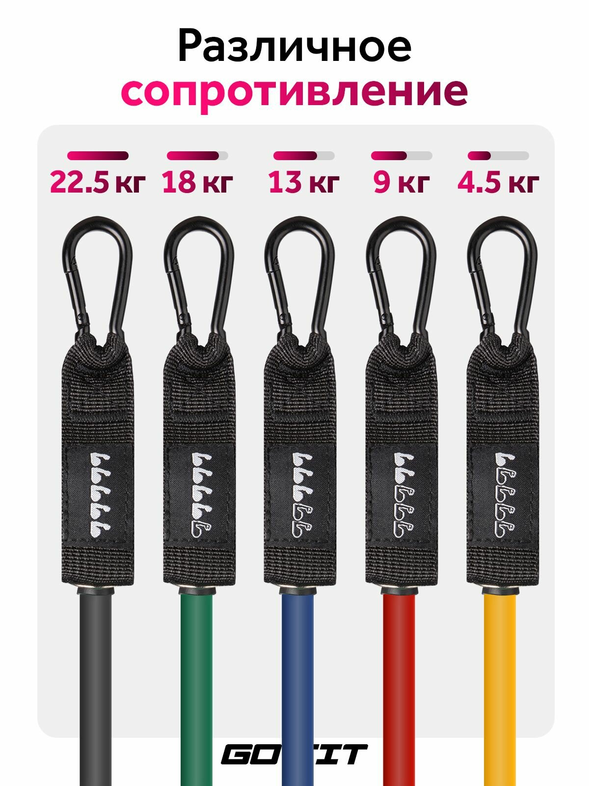 В набор входит 5 трубчатых эспандеров с разной степенью нагрузки от 4,5 до 22,5 килограмм. Меняя их, вы сможете усиливать или же, наоборот, ослаблять, нагрузку во время тренировки.