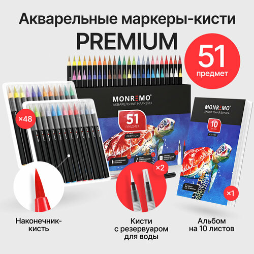 Набор акварельных маркеров Monremo - это отличный старт для начинающих художников и замечательное дополнение к инструментарию профессионалов. Мы предлагаем вам комплекты на 26 и 51 предмет (24/48 фломастеров-брашпенов, 1/2 кисти с резервуаром для воды и альбом формата А5 на 10 плотных листов с пружинами). Каждый цвет уникален, поэтому вы сможете разнообразить свое творчество и создать рисунки в ярких, сочных красках. Гибкий наконечник канцтоваров позволит вам заниматься каллиграфией и теггингом, оформлять записи в школьной тетради или скетчбуке, а чернила на водной основе помогут создавать градиент и другие необычные эффекты на бумаге. Ручка с контейнером для воды обеспечивает безопасность холста - никаких стаканов или банок, которые могут опрокинуться и залить рисунок. Художественные принадлежности - это прекрасный подарок для детей и взрослых. Маленькие девочки и мальчики смогут освоить новое хобби и познакомиться с раскрашиванием, а подростки - овладеть разными техниками.