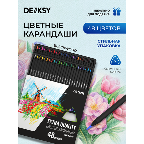 Цветные карандаши Blackwood от DENKSY с супермягким грифелем 48 цветов в картонной упаковке. Карандаши премиум качества из черного дерева с ярким и мягким грифелем, диаметром 3 мм. Мягкие цветные карандаши Блэквуд имеют трехгранную форму корпуса. Набор цветных карандашей также отлично подходит для использования в школе. Они не только помогут вашему ребенку раскрыть свои творческие способности, но и будут полезны при выполнении заданий по изобразительному искусству. Супер мягкий, но ударопрочный грифель позволит добиться необходимой насыщенности цвета почти без усилий. Тонкий помол пигментов даст возможность получения плавных цветовых переходов. Большой подарочный набор цветных карандашей станут незаменимым аксессуаром в вашей школьной канцелярии или концелярии для рисования. Эти карандаши — отличный выбор для школьников и студентов, а также для всех, кто увлекается рисованием и творчеством. Они подойдут для школы в качестве детских карандашей для рисования - так как насыщенность высокая, ребенку не придется сильно давить на карандаши. Цветные карандаши из черного дерева - это отличный подарок художнику на новый год, 23 февраля, 8 марта.