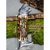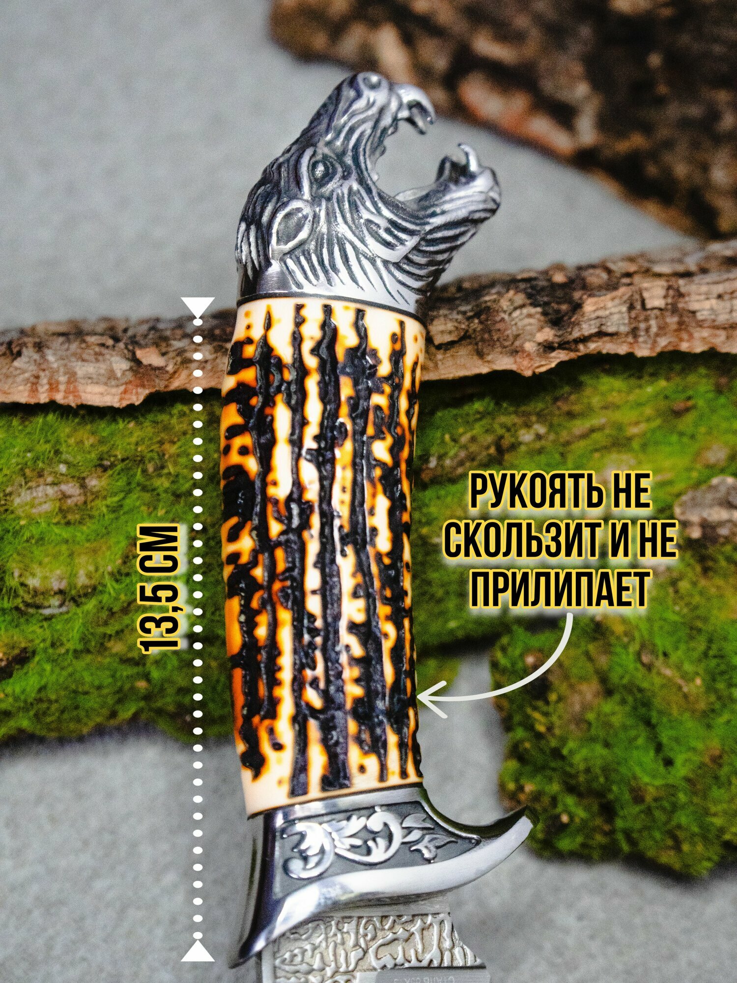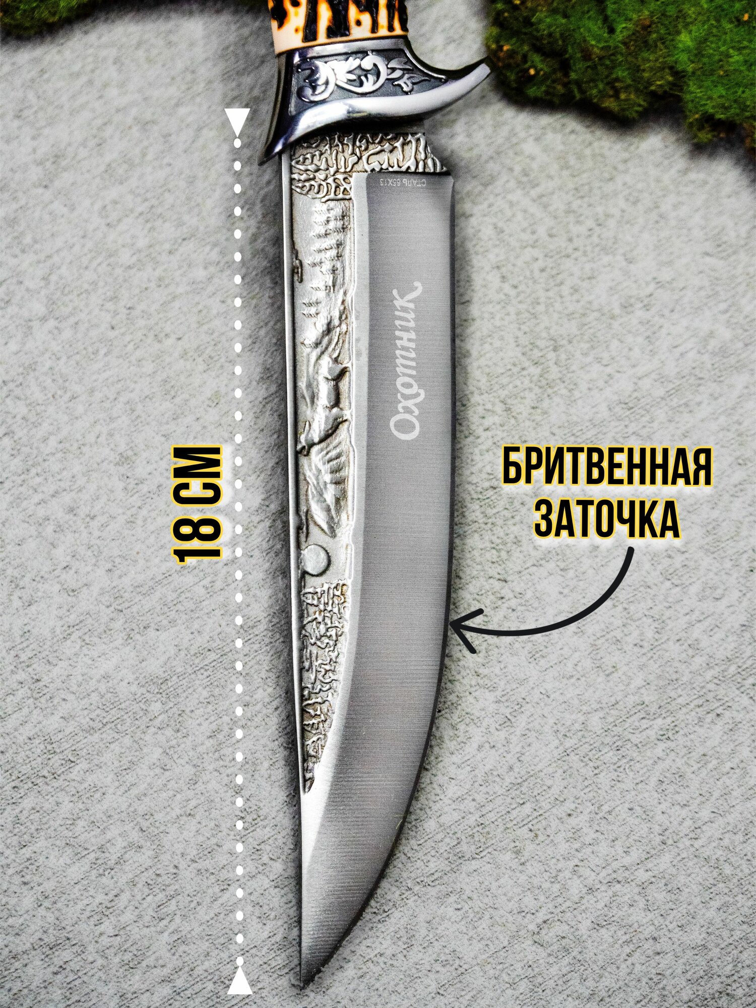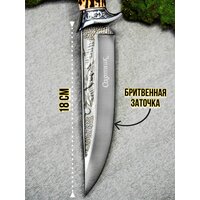 Изготовлен в частной Кизлярской кузнице из прочной нержавеющей стали 65*13, что гарантирует его долговечность и стойкость к коррозии. На клинке имеется гравировка "Охотник", подчеркивающая статус ножа.