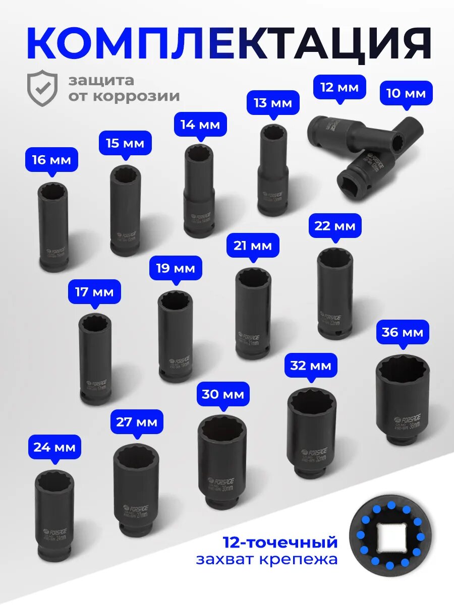 Набор головок ударных глубоких, 16ПР,12(10-19, 21, 22, 24, 27, 30, FORSAGE F41695MPB (1 шт.)