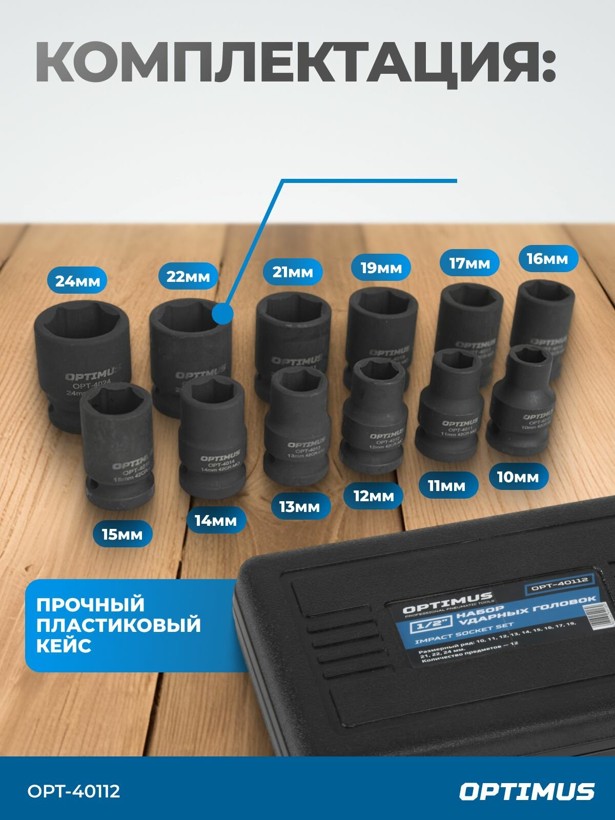 Купить Набор ударных головок 1/2″ 12 предметов, 10-24 мм OPT-40112 OPTIMUS HD с доставкой по всей России. Набор ударных головок 1/2″ 12 предметов, 10-24 мм OPT-40112 OPTIMUS HD: сравнение цен, характеристики, фото, актуальное наличие и цены.