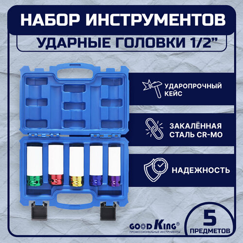 Набор ударных головок GOODKING предназначен для установки и снятия гаек крепления колес, находящихся в глубоких посадочных местах. Подходит для работы с пневмоинструментом. Пластиковое покрытие головок защищает обод диска от возможных повреждений и сколов. Пластиковый кейс позволяет удобно хранить все головки в одном месте.