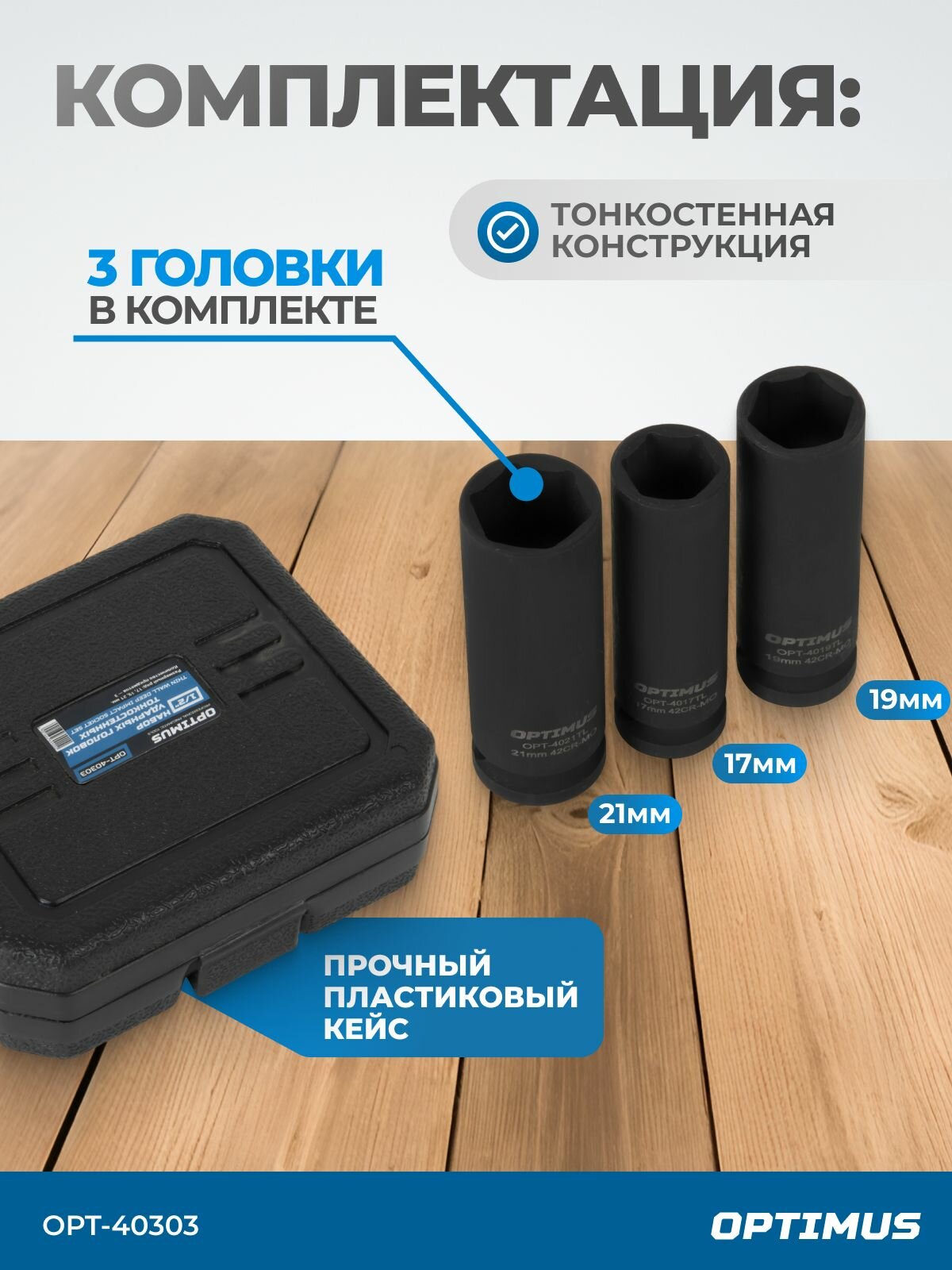 Набор ударных головок тонкостенных 1/2″ 3 предметов, 17,19,21 мм OPT-40303 OPTIMUS HD: сравнение цен, характеристики, фото, актуальное наличие и цены.