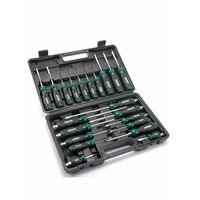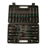 Набор ударных отверток — это комплект профессиональных отверток с шестигранных стержнем. Такой набор прекрасно подойдет для бытовых работ и для профессионального ремонта и строительства. Благодаря его качеству и грамотной комплектации это хороший подарок на 23 февраля для мужчины. В наборе Вы получаете 21 предметов. В комплекте есть все самые необходимые отвертки — прямого шлица, крестообразные, ударные. Все предметы представлены в разных размерах, поэтому Вы всегда найдете нужную отвертку для любого вида работ. С ними Вы легко выполните сборку автомобиля, садовой техники, мототехники и пр. Ударные отвертки набора имеют магнитный наконечник, который удерживает винты даже в перевернутом положении. Ударно-поворотный механизм справится с отрывом проблемного крепежа. Фиксация краской или специальными средствами, коррозия — с этими отвертками это не проблема. Все инструменты набора имеют высокое качество и прочность. Они выполнены из закаленной стали, имеют крепкие прорезиненные рукоятки и защищены антикоррозийным покрытием. Набор ударных отверток идет в комплекте с прочным кейсом. С ним необходимые инструменты всегда будут под рукой и удобно закреплены внутри чемоданчика.