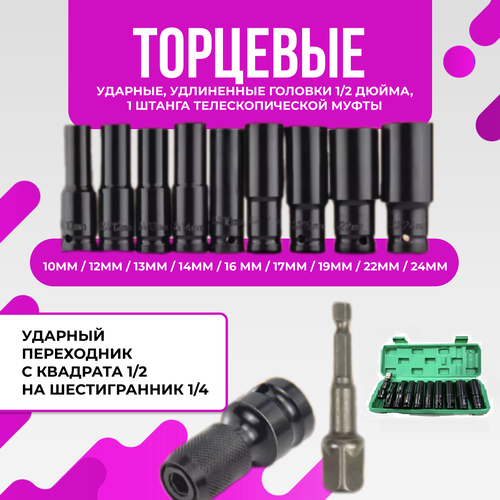 Набор из 10 торцевых ударных головок + 1 штанга телескопической муфты - это незаменимый помощник для любого автолюбителя. Он включает в себя разные размеры, чтобы соответствовать вашим потребностям при работе с гайковёртами. Уникальный дизайн коленного типа обеспечивает максимальную комфортность и удобство во время работы. Кроме того, прочный корпус из высококачественного материала защищает головки от повреждений и обеспечивает их долгий срок службы. Все эти преимущества упакованы в компактный и практичный кейс, который можно легко перевозить вместе с вами. Этот набор торцевых ударных головок - идеальное решение для тех, кто ценит качество и надежность